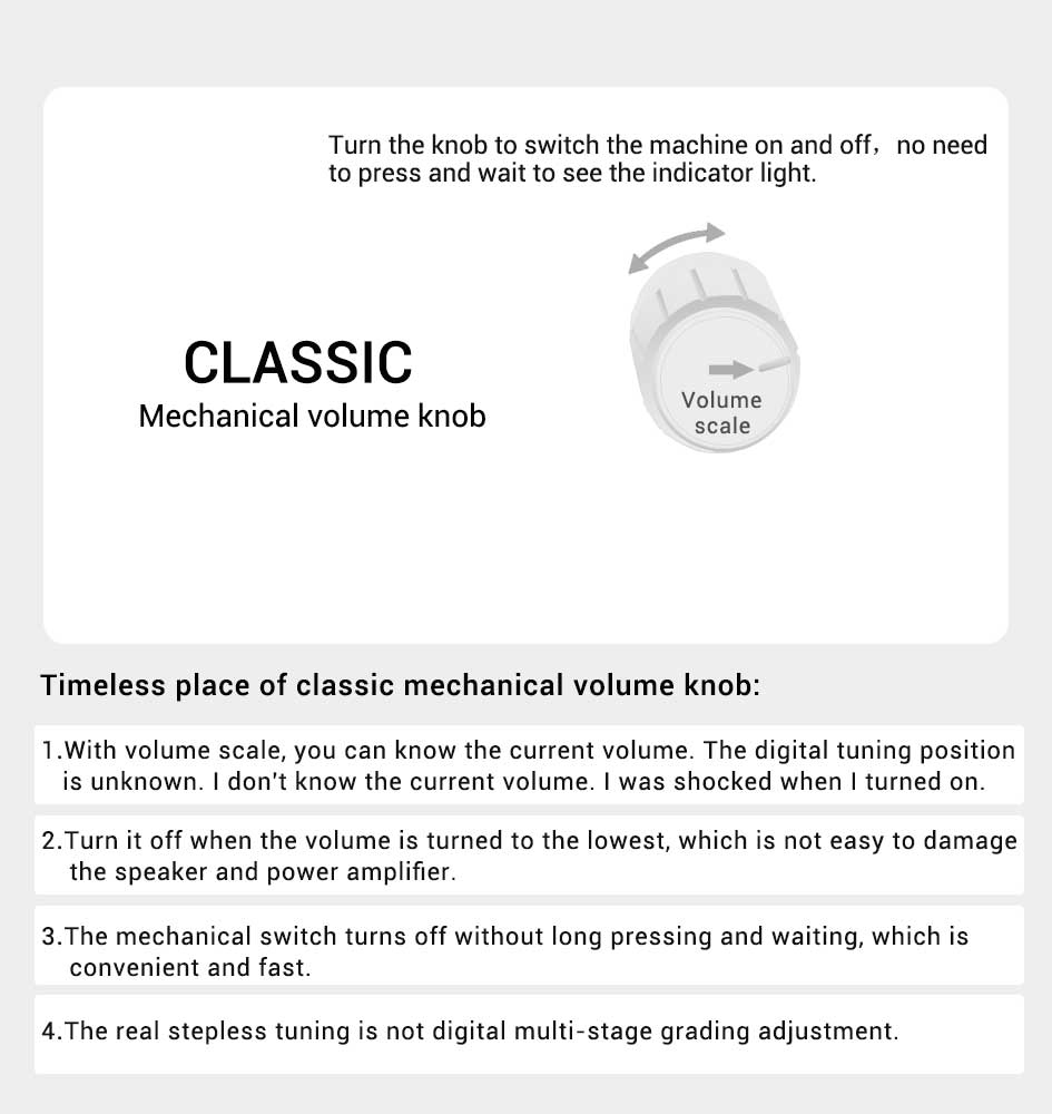 4. Механический регулятор громкости, поверните ручку, чтобы включить и выключить устройство, не нужно нажимать и ждать, чтобы увидеть