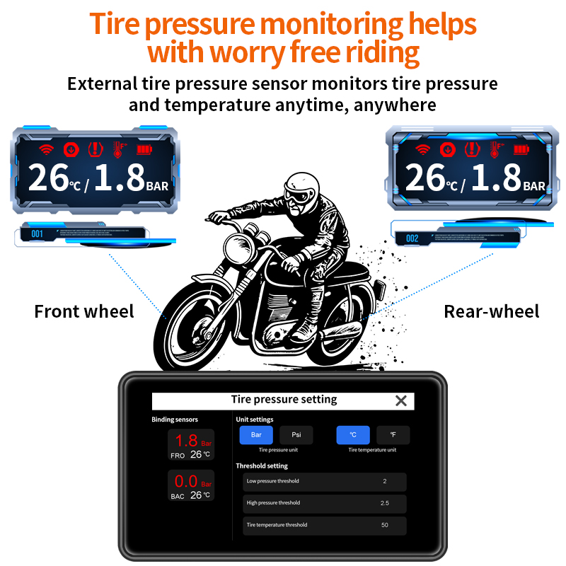 3, видеорегистратор мотоцикла с TPMS: включает 2 датчика шин для мониторинга давления и температуры в реальном времени, обеспечения безопасности и информированности ваших аттракционов