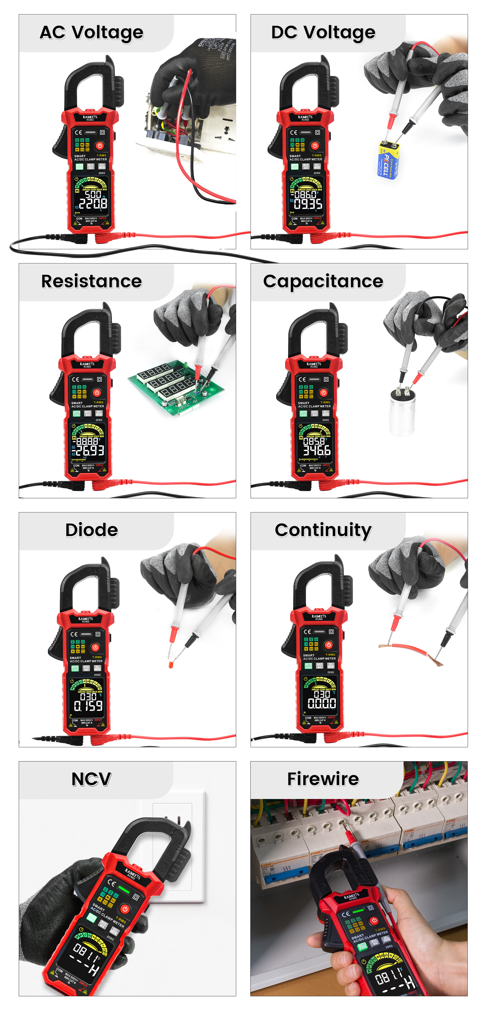Это точные интеллектуальные Токоизмерительные клещи, он имеет два режима, он может измерять переменный/постоянный ток, переменное/постоянное напряжение, сопротивление, непрерывность в автоматическом режиме, и может измерять больше в ручном режиме, подходит для электриков и домашнего хозяйства.