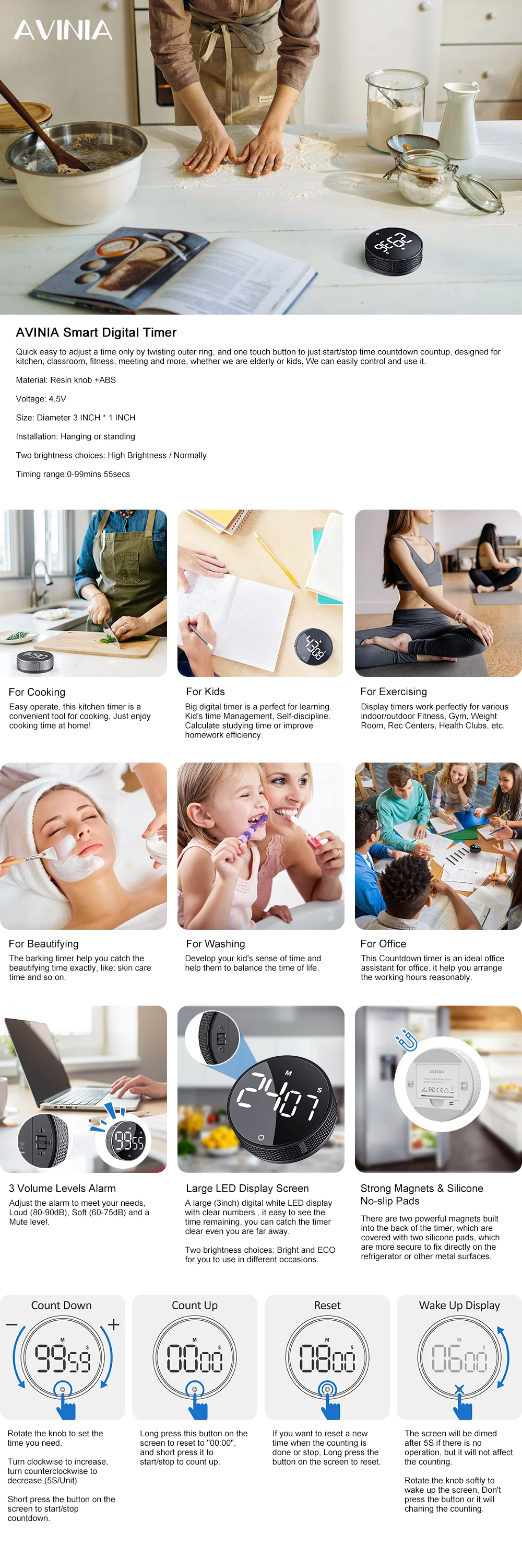 【 Energy saving & 365 days Guarantee】:Powered by 3 AAA batteries; if timer doesn't run and without any operation, display brightness will turn dim then light off in a few seconds. Don't worry it will not consume energy in the sleep mode. Each AVINIA TIMER has a full-year quality guarantee and detailed instructions manual, please rest assured to order.