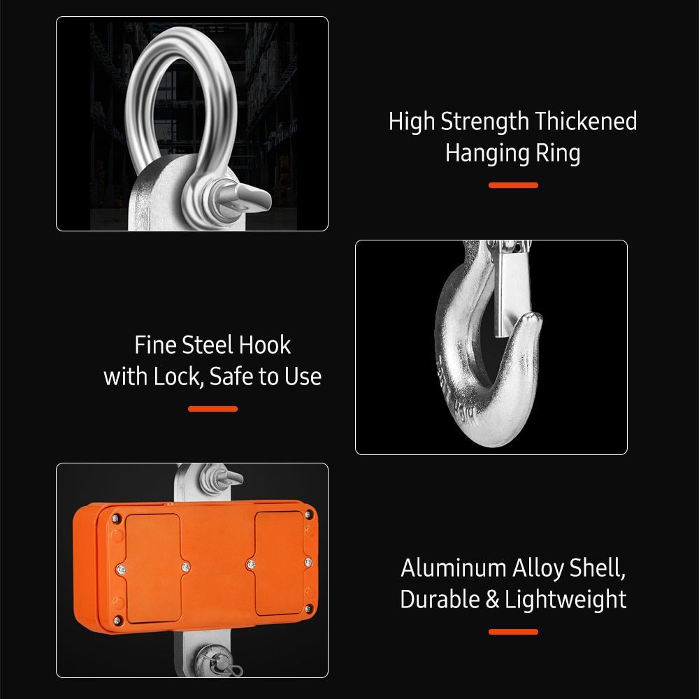 Сверхмощные крановые весы с дистанционным управлением-Максимальная несущая способность 1500 кг, с высокой точностью. Подходит для пищевой/стальной промышленности, строительной площадки, наружной работы и т. д. Оснащен пультом дистанционного управления, расстояние управления 20 м (65 футов) для более удобного использования.