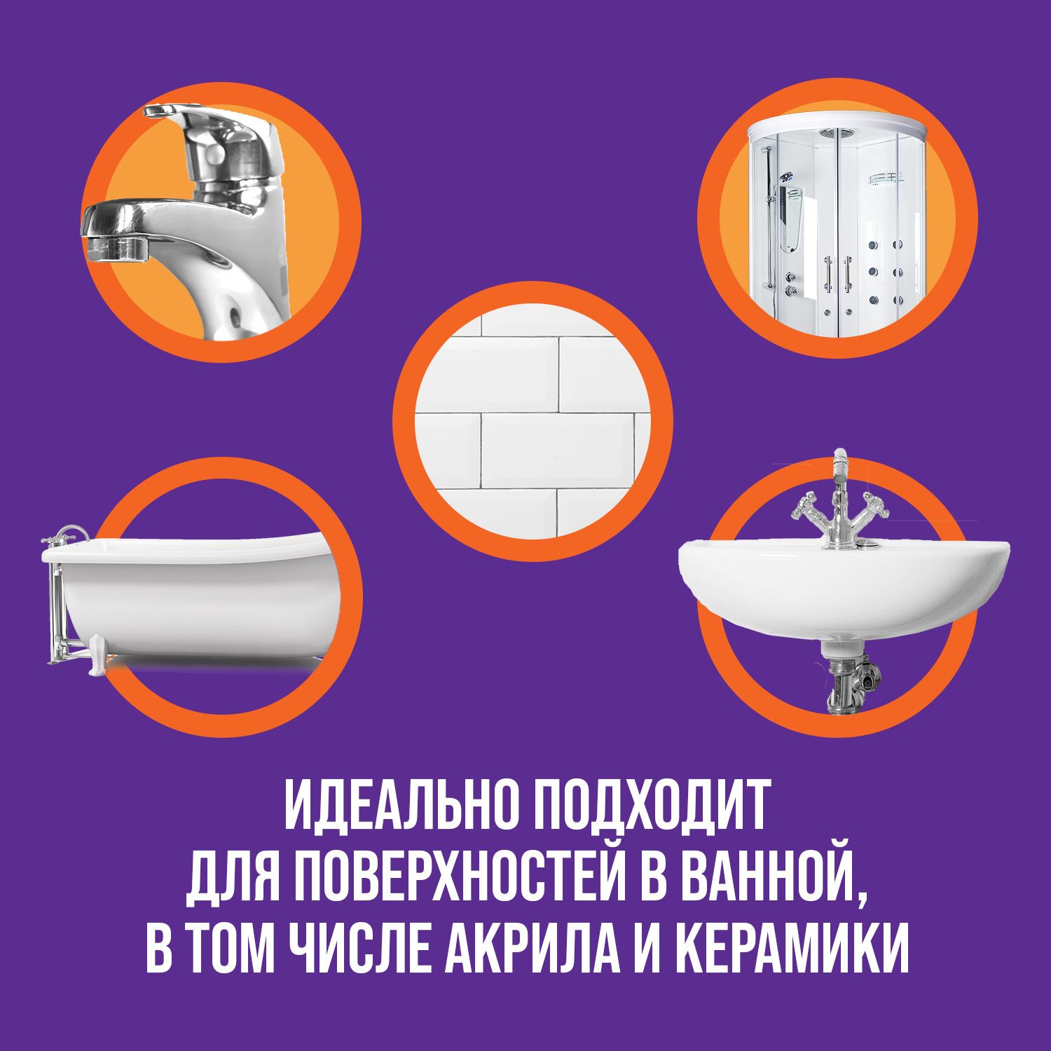 Идеально подходит для чистки хромированных, керамических, пластиковых, стеклянных поверхностей, а также поверхностей из нержавеющей стали и акриловых ванн.