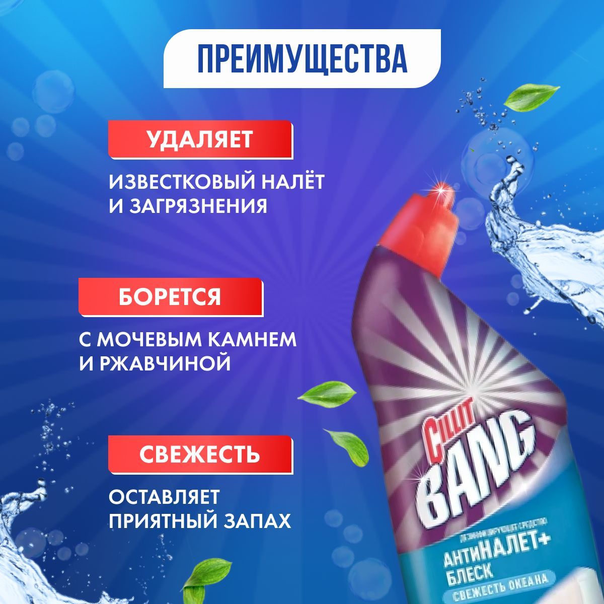 Описание: Средство дезинфицирующее для туалета Bang "Анти-налет и Блеск CILLIT" удаляет известковый налет, мочевой камень, ржавчину и другие загрязнения. Продукт действует уже через 1 мин. и меняет цвет во время действия. Средство чистит над и под водой, а также под ободком унитаза. Этот продукт убивает 99,9% микробов, но для этого его необходимо оставить на 60 мин. Средство ароматизирует туалет и должно использоваться только для чистки.