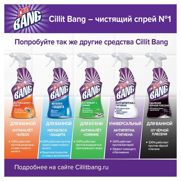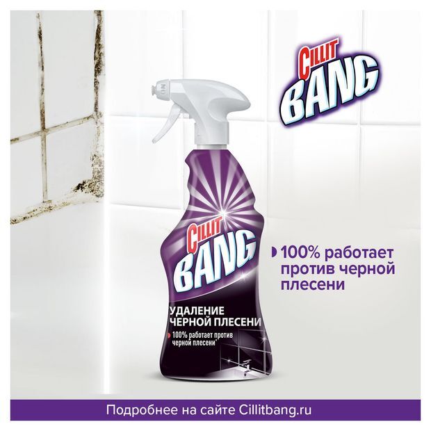Описание: Чистящее средство Cillit Bang Удаление черной плесени эффективно устраняет плесень и грибок, теперь не нужно прикладывать усилия для того, чтобы оттереть въевшееся пятно. Идеальное средство для сырых поверхностей, подвергающихся образованию плесени и грибка. Идеально подходит для уборки ежедневных или застарелых пятен, в том числе черного плесневелого налета и грибка, для различных материалов и поверхностей, таких как раковины, ванны, душевые кабины, рабочие поверхности на кухне и др. Эргономичный флакон оснащен высоконадежным курковым распылителем, позволяющим легко и экономично наносить раствор на загрязненную поверхность. На некоторых поверхностях (гранит, мрамор, медь, латунь, глянцевые поверхности, линолеум, текстиль, ковры, резина, обработанный деревянный пол) не рекомендуется использовать Cillit Bang Удаление черной плесени. Применение: наденьте защитные перчатки. Распылите средство, держа бутылку прямо на расстоянии минимум 10-15 см от поверхности. Оставьте средство на поверхности до 15 минут. Потрите поверхность губкой/тряпкой. Тщательно смойте водой. Перед использованием всегда пробуйте средство на менее заметном участке в течение 3 минут. BANG и плесени как не бывало!