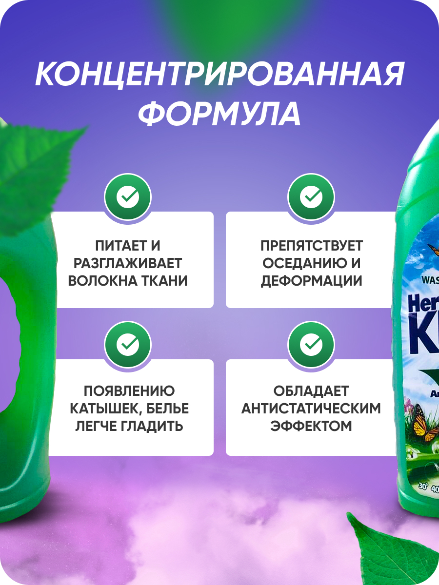 Особенности применения: Антибактериальный эффект, Антистатический эффект, Гипоаллергенность, Концентрат, Экосредство, Эффективен в холодной воде