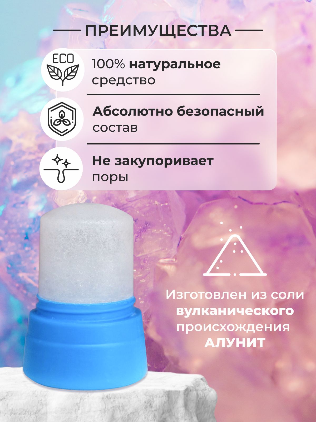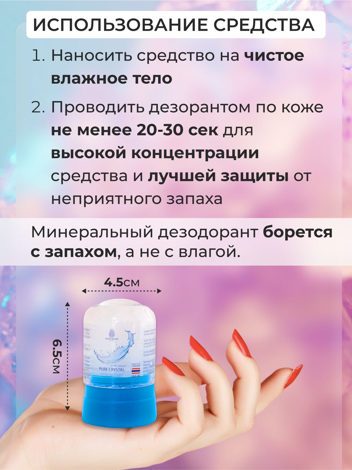 Описание: Дезодорант кристалл Coco Blues изготавливается из вулканического камня алунита - природного антисептика. Не оставляет следов на одежде, ни на белой, ни на чёрной. Подходит как для мужчин, так и для женщин, для беременных женщин и кормящих матерей. Можно использовать подросткам, как мальчикам, так и девочкам. Не вызывает аллергии и раздражения. Очень экономичный. При правильном применении одного кристалла хватает в среднем на 12-18 месяцев ежедневного применения. Дезодорант кристалл натуральный не имеет выраженного запаха, поэтому не спорит с парфюмом. Дезодорант женский натуральный не требует повторного нанесения в течении дня, и подходит для ежедневного использования! Сам кристалл лучше не смачивать, так он быстрее заканчивается. Эффективность алунита будет значительно ниже, если на коже имеются волосы. Дезодорант стик женский без запахов не рекомендуем наносить на подмышечную впадину в первые 3-4 часа после бриться или депиляции, т.к. это соль, и если Вы наносите это средство на недавно травмированную кожу может возникнуть пощипывание. При падении кристалл разбивается в «дребезги» и тереть тело осколками по понятным причинам становится невозможным. Но даже если он упал и разбился, то его не нужно выкидывать. Остатки средства можно растворить в 100 мл тёплой воды. Тогда Вы получите концентрированный раствор этого средства, минеральный дезодорант кристалл спрей, который можно перелить в любую тару и распылять средство на нужную область. Выше описанными способами можно убирать запах на любом участке тела, в том числе «под грудью», или на ногах. Дезодорант для ног от запаха больше не потребуется! В нашем ассортименте представлены четыре варианта алунитов. Абсолютно не имеющий запаха, а также три варианта с лёгкими ароматами «алоэ», «мангостина» и «кокоса». Ароматы очень лёгкие и запах от них будет еле уловимым. Сильно выраженных запахов они не имеют. Если Вы будете следовать нашей инструкции применения, то влюбитесь в этот кристалл раз и навсегда! Способ применения: после принятия душа берём в руки кристальный дезодорант и трём им по мокрой подмышечной впадине на протяжении 20-30 секунд. Да это очень важно – не «пару раз» - а именно 20-30 секунд. Причём если «камень» начинает плохо «скользить», то значит нужно смочить немного ладонь и добавить воды в подмышечную впадину. Необходимо именно очень хорошее скольжение. Когда Вы трёте кристальным дезодорантом по сильно мокрому телу он немного растворяется (точнее растворяется соль, из которой он сделан) и она остаётся на поверхности кожи. Чем дольше Вы «трёте», тем дольше не пробьётся запах! Дезодорант без запаха убивает бактерии везде! Не будет бактерий = не будет запаха пота.