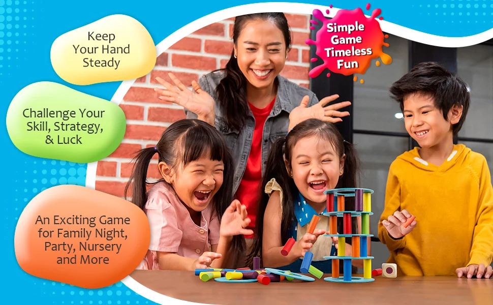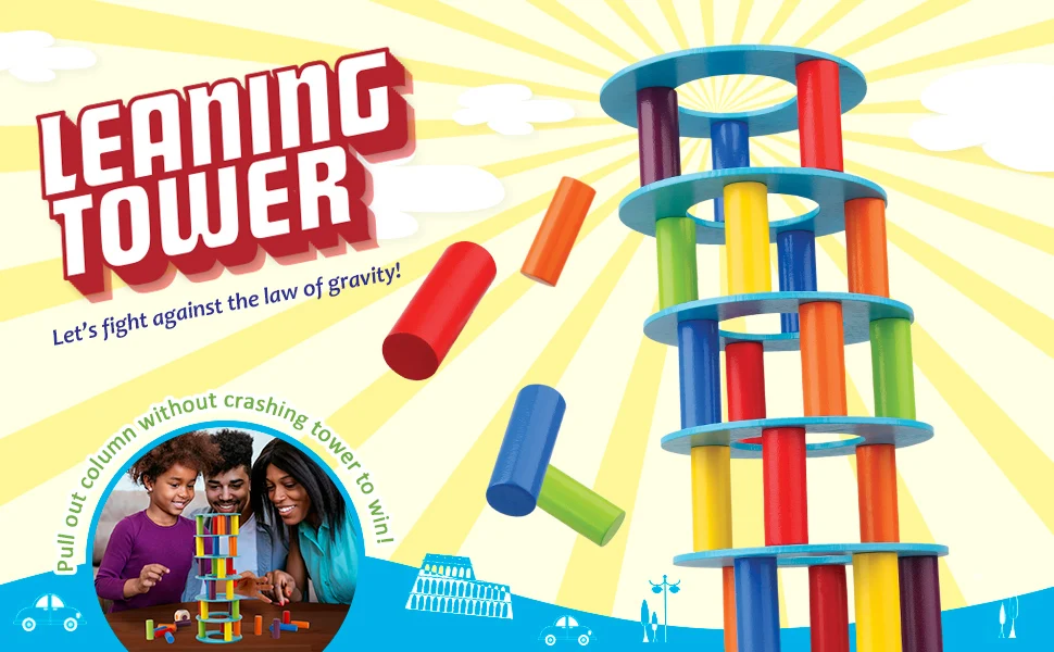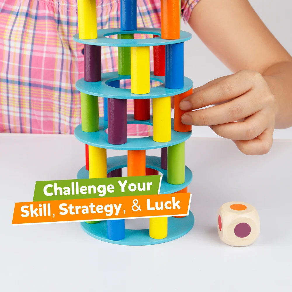 Построить деревянную башню, разместив цветные колонны пошаговую игру. Игроки будут по очереди катать кости, затем осторожно снимая вытаскивать соответствующий цветовой блок. Разноцветные блоки имеют гладкую поверхность, что позволяет легко снимать их. Игрок, который сбивает башню, проиграет игру.