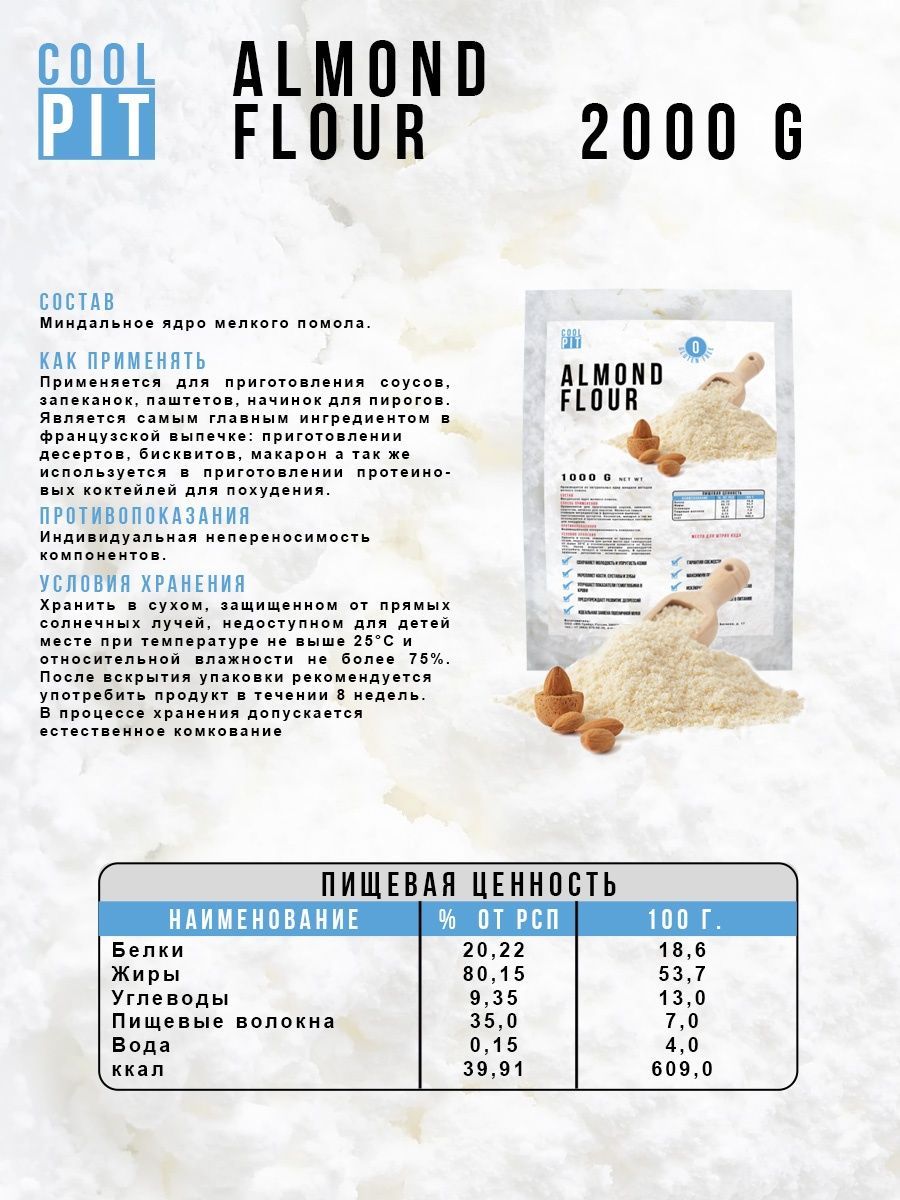 Описание: Миндальная мука Cool Pit есть не что иное, как перемолотый в мелкий порошок миндальный орех, один из самых вкусных представителей орехового братства. Лечебные свойства миндальной муки обусловлены её химическим составом, в котором содержатся: насыщенные жирные кислоты, холин, бета-каротин, витамины В1, В2, В5, В6, В9, А, С, Е и РР, а также калий, кальций, магний, цинк, селен, медь и марганец, железо, хлор и сера, йод, хром, фосфор и натрий. Миндальная мука не только вкусна, но и чрезвычайно полезна, её рекомендуется употреблять при нарушении зрения, бессоннице, малокровии и судорогах. Мука миндальная мелкого помола без глютена идеальна для выпечки, десертов (макаронс, марципана, бисквитов, печенья) и для загущения соусов и крем-супов. Мука из миндаля это и правильное питание, спортивное питание для похудения и незаменимый компонент, чтобы приготовить кондитерский крем, протеиновый коктейль, коктейль для похудения и спорт питание. Веганский продукт, отлично подходит для кето диеты, без консервантов, без добавок, без ГМО.
