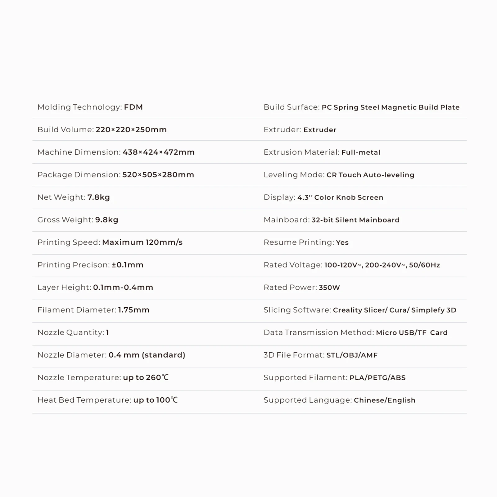 MK-8 экструдер значительно снижает риск закупорки и плохой экструзии; И парник может достигать 110 ℃ примерно за 5 минут, чтобы удовлетворить потребности быстрого нагрева и печати.