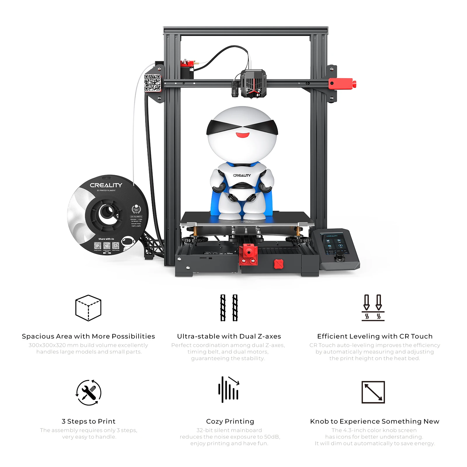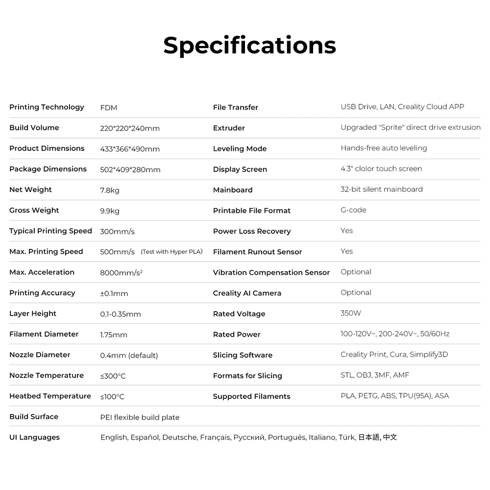 ♦Компактный принтер, но все же предлагает больше: только с размером продукта 433x366 мм, но может печатать модель 490x220 220x240 мм, и он занимает меньше места, вы можете просто положить его на стол с 3-ступенчатой сборкой. Ender-3 V3 KE может обрабатывать нити Hyper PLA, PETG, ABS, TPU(95A) и ASA. Просто выберите тот, который вам нравится, чтобы напечатать любой повседневный товар, деталь или товар.