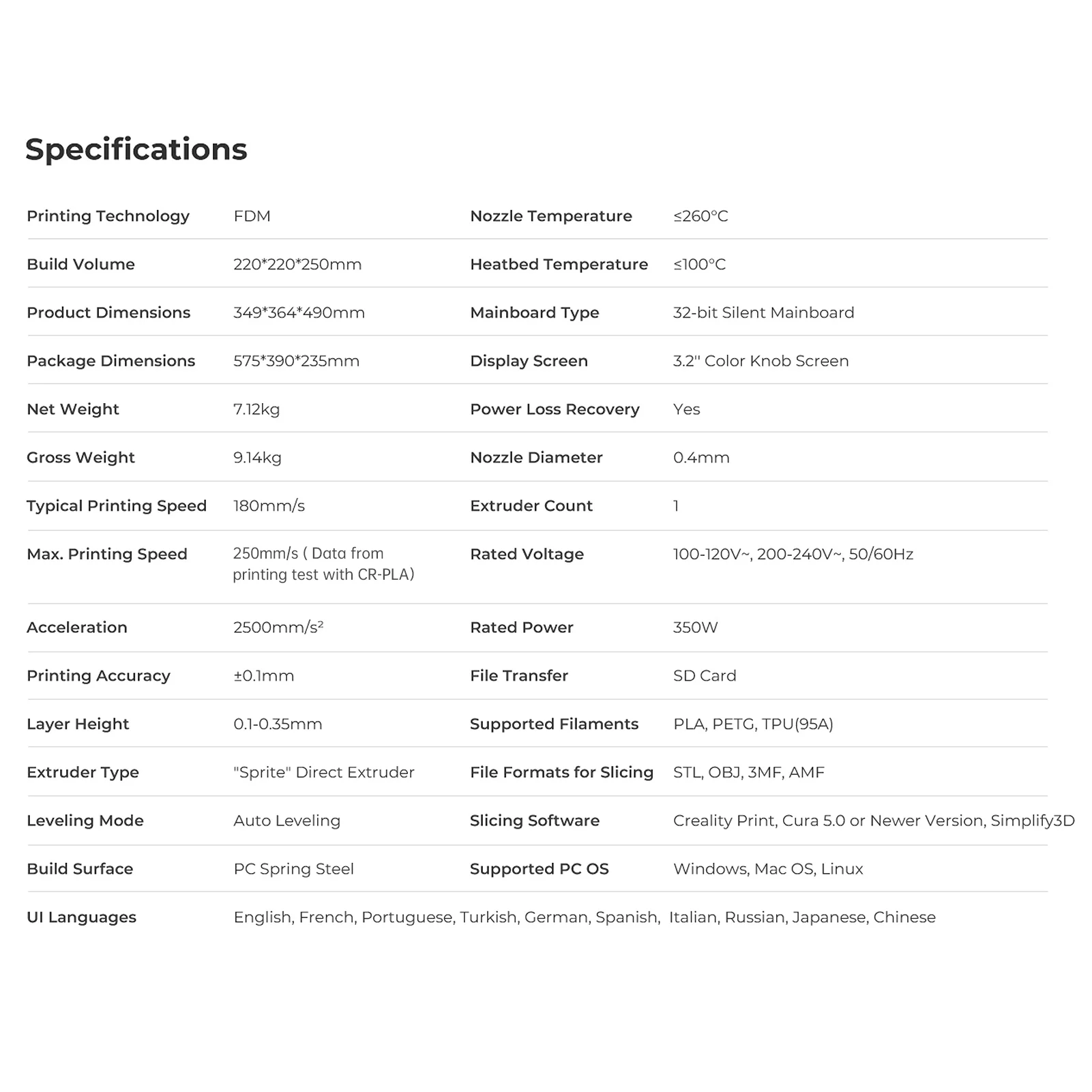 Ender-3 3D-принтер V3 SE: Ender-3 V3 SE компактен, прост и элегантен. Он сочетает в себе аккуратные оси X, Y, Z, гладкие Т-образные профили и сдержанные натяжители для гладкого вида. Меньше для размещения, но по-прежнему предлагает достаточный объем сборки-220*220*250 мм.