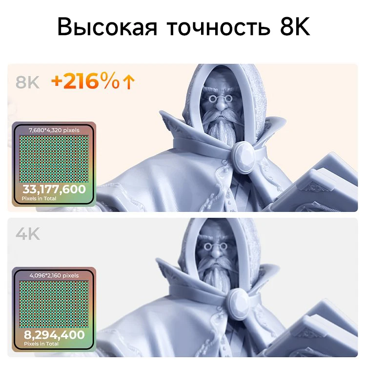 Высокая точность Ultra 8K: 3D-принтер смолы Halot-Mage оснащен 8K-моноблочным ЖК-дисплеем с разрешением 33 177 600 пикселей и 29,7 мкм по XY, что является огромным скачком по сравнению с 50 мкм обычного 4K. Оживают волосы, ткани, текстуры кожи и органические формы.