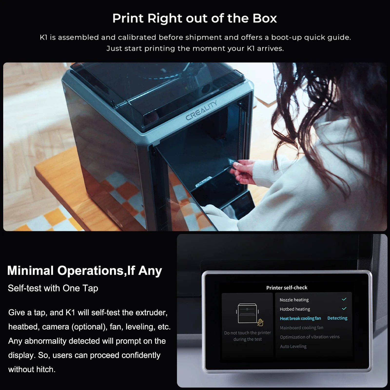 ♦Удобная платформа и пользовательский интерфейс: Поддержка одного ключа к автоматическому выравниванию. Оснащен гибкой пластиной сборки, которая работает с широким спектром нитей. Алюминиевый сплав с нагревом может равномерно достигать 60 ℃ всего за 180 секунд. Просто нажмите, и K1 самостоятельно проверит экструдер, нагрев, камеру (опционально), вентилятор, выравнивание и т. Д. Любая обнаруженная ненормальность появится на дисплее.