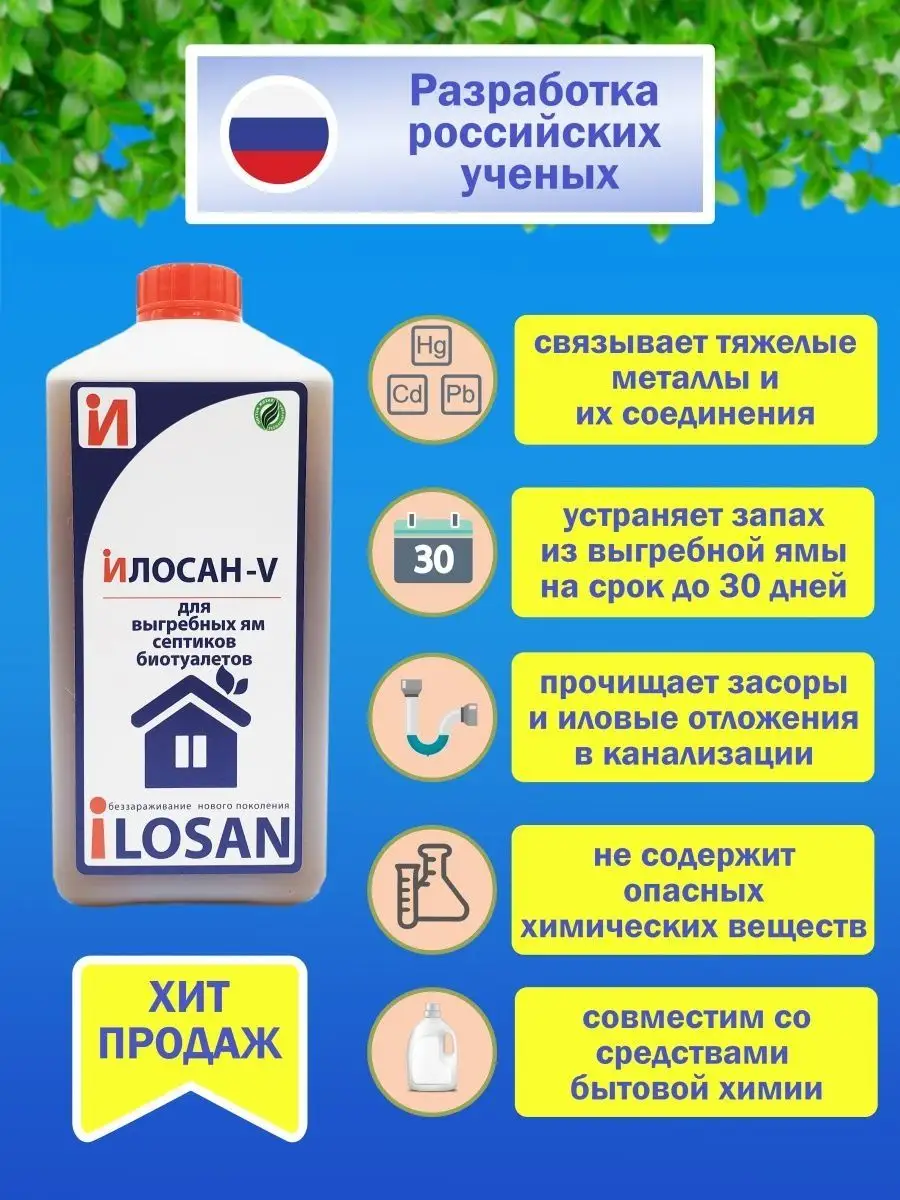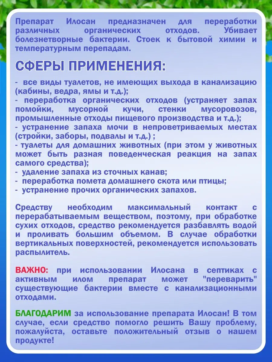 Описание: Дачные туалеты и септики – дурно пахнущая тема, но только не с «Илосаном». Промышленный препарат Илосан решает весь комплекс проблем дачных туалетов и септиков. Обладает дезинвазивными и дезодорирующими свойствами, устраняет фекальный запах в течении получаса, успешно снимает зажиренность почвы. Илосан успешно применяется с целью обеззараживания содержимого выгребных ям, септиков и дачных туалетов, нейтрализации и подсушивания содержимого и уменьшения запаха.Инновационное эффективное средство для выгребных ям. Средство для септиков Илосан удаляет запахи и нейтрализует вредные бактерии. Средство от неприятного запаха в туалете «Илосан» полностью уничтожает патогенную микрофлору практически любой концентрации, яйца гельминтов, яйца нематодов, яйца колорадского жука и саранчи, препятствует развитию различных плесневых грибов, удаляет черную плесень, связывает активности тяжелых металлов.Разработка отечественных ученых, эффективность cредства для дачных туалетов подтверждена исследованиями и сертификатами.Применять средство для дачных туалетов и выгребных ям просто. необходимо вылить раствор средства в выгребную яму, сточную канаву, биотуалет и наслаждаться результатом - запахи гарантированно уйдут на срок до 31 дня.Использование нашего средства для очистки выгребных ям поможет вам полностью избавиться от неприятных запахов в туалетах на даче. Опыт эксплуатации средства для ям и септиков «Илосан» показал, что это одно из наиболее эффективных средств для септиков, оно не содержит хлора и не оставляет запаха.Препарат для выгребных ям работает при положительных температурах. Препарат для септиков «Илосан» универсален, он может быть использован в том числе и для удаления запаха мочи домашних животных. Средство для дачного туалета «ИЛОСАН» обладает всеми необходимыми преимуществами и универсальностью. Биоактиватор для дачных туалетов «Илосан» полностью устраняет фекальный запах в течении получаса. Наше средство для ямы дачного туалета обладает овицидными, дезинфекционными, флоккулирующими свойствами. Бактерии для дачных туалетов связывают молекулы тяжелых металлов в устойчивые и нетоксичные комплексы. Средство от запаха в дачном туалете существенно улучшает характеристики водоотдачи и сушки обрабатываемого осадка. Наше средство для дачного туалета позволит превратить отход в чистое и экологичные удобрение. Средство для септиков и выгребных ям «Илосан» - мы позаботимся!Дезинфектор без нарушения экологического баланса, полностью из растительного сырья - препарат для септиков и выгребных ям «Илосан». Ликвидация запахов сточных вод, свалок и инфильтрата! средство для удаления неприятного запаха «Илосан» с успехом решил все эти задачи.Канализационные ямы засорены. Решение простое - обработать ямы канализации средством для очистки выгребных и канализационных ям! Запах исчезнет за считанные минуты! Препарат для выгребных ям, септиков и дачных туалетов. Препарат для очистки выгребных ям обладает дезинвазивными и дезодорирующими свойствами, устраняет фекальный запах в течении получаса, успешно снимает зажиренность почвы. Промышленный препарат Илосан решает весь комплекс проблем дачных туалетов и септиков. Средство для дачных туалетов и выгребных ям «Илосан» не пахнет! Принцип действия 