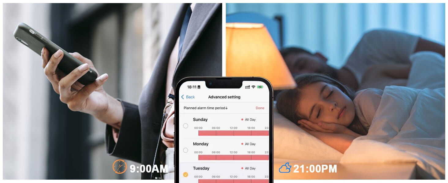 При срабатывании по движению камера автоматически отслеживает цель, отправляет тревожное уведомление в режиме реального времени и активирует звуковую и световую сигнализацию в ночное время, которую можно включать и выключать по мере необходимости.