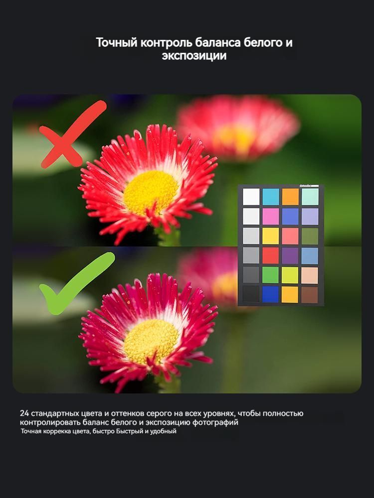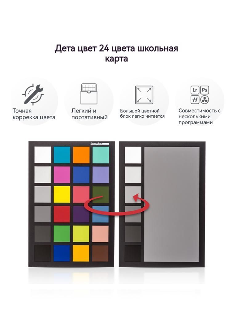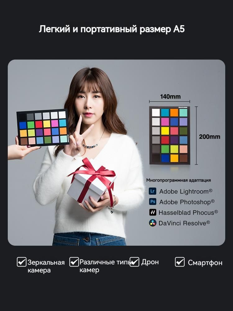 Ценностное предложение :Мишень Datacolor SpyderCHECKR 24 обеспечивает точность полноразмерных, спектрально разработанных пигментных пятен в тонкой, портативной и доступной по цене цветовой мишени, предназначенной как для фото-, так и для видеосъемки. Серая поверхность SpyderCHECKR 24 обеспечивает настройку баланса белого и экспозиции в камере и после обработки, а цветная поверхность позволяет автоматически корректировать цвет в Adobe Photoshop ACR, Adobe Lightroom, Hasselblad Phocus и Blackmagic DaVinci Resolve.