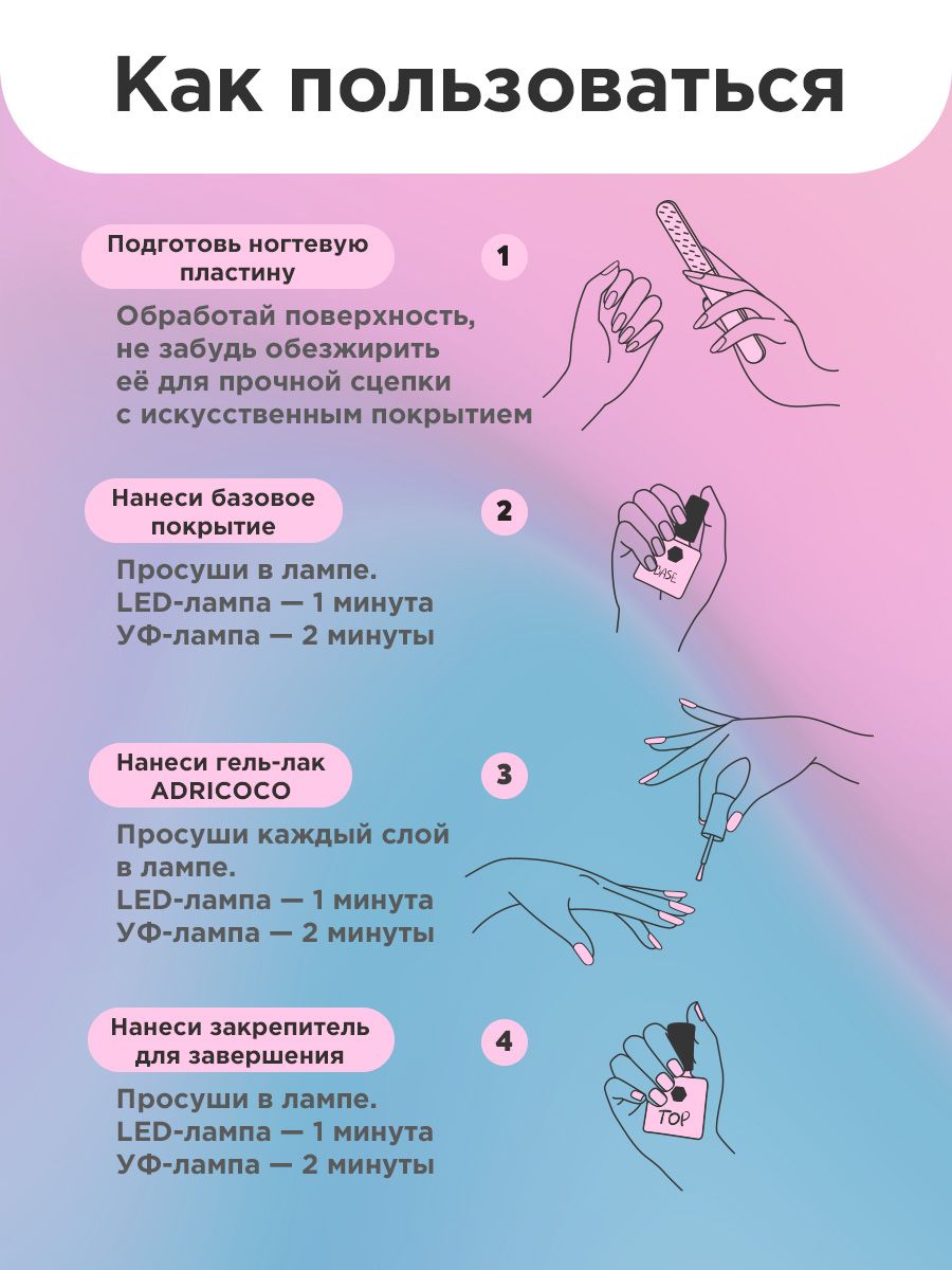 Описание: О товареГель-лаки ADRICOCO – это взрыв цвета в каждом флаконе. Покрытия содержат насыщенные пигменты, обеспечивают яркий и стойкий маникюр в течение долгого времени. Благодаря средней консистенции легко наносятся и равномерно распределяются по ногтевой пластине.Способ применения:Подготовьте ногти: снимите глянец мягким бафом, обезжирьте, нанесите праймер.