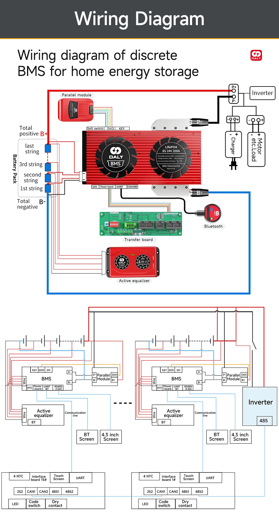 Daly Smart BMS Lifepo4 с интеллектуальным активным балансером 4S 12V 8S 24V 16S 48V 100A 150A 200A 250A 18650 батарея для эквалайзера накопления энергии с RS485 и может общаться
