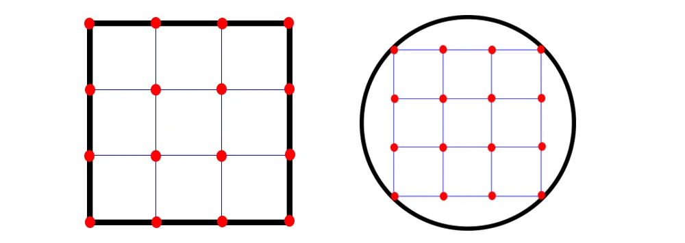 As shown in the figures above, the black wireframe is the effective printing range of the printing platform. When the leveling point is set to 4 points in the system, the value selection points of auto-leveling probe on the printing platform will be all the red dots as shown above. All these red dots divide the printing platform into small squares or rectangles. Then the system will store the data for all points in the system. As a result, the print platform is divided into multiple small platforms. After leveling, when the print head moves, the system will take the measurement data of the four points around the area according to the real-time running area of the print head, and then calculate the real-time height compensation amount of the print head according to the data, to reach the goal of leveling the whole platform. For the Delta model printers, after detecting, it will expand the dead zone data based on the surrounding data.