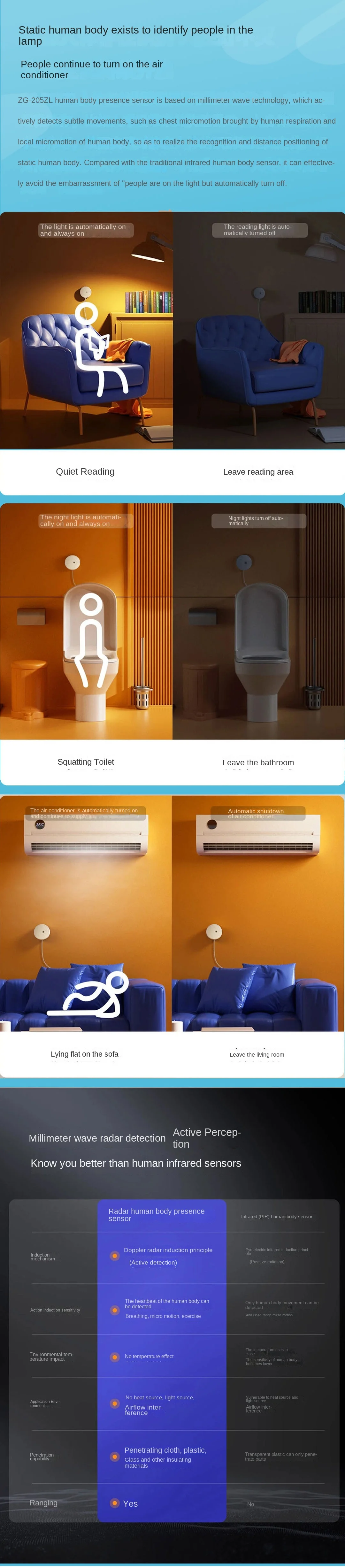 Отличаемые как присутствие человека, Статика человека, микродвижения человека и обнаружение движения человека для обнаружения присутствия или отсутствия людей в этом районе, даже для обнаружения статического состояния, например, точного сна персонала с помощью радарного обнаружения в миллиметровом волне.