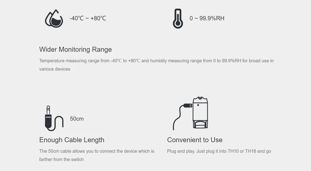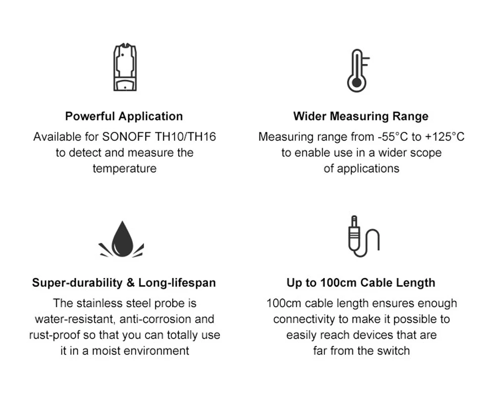 С помощью новейшего приложения eWeLink пользователи могут создавать серию простых условных операторов (Smart Scene) для включения/выключения других интеллектуальных устройств. Это означает, что пользователи могут использовать Sonoff TH10 или Sonoff TH16 с датчиком AM2301, DS18B20 или DHT11 для сбора данных о температуре/влажности, которые можно использовать в качестве условия для включения/выключения других устройств, такие как Sonoff, Sonoff RF, Sonoff SV, интеллектуальная розетка S20.