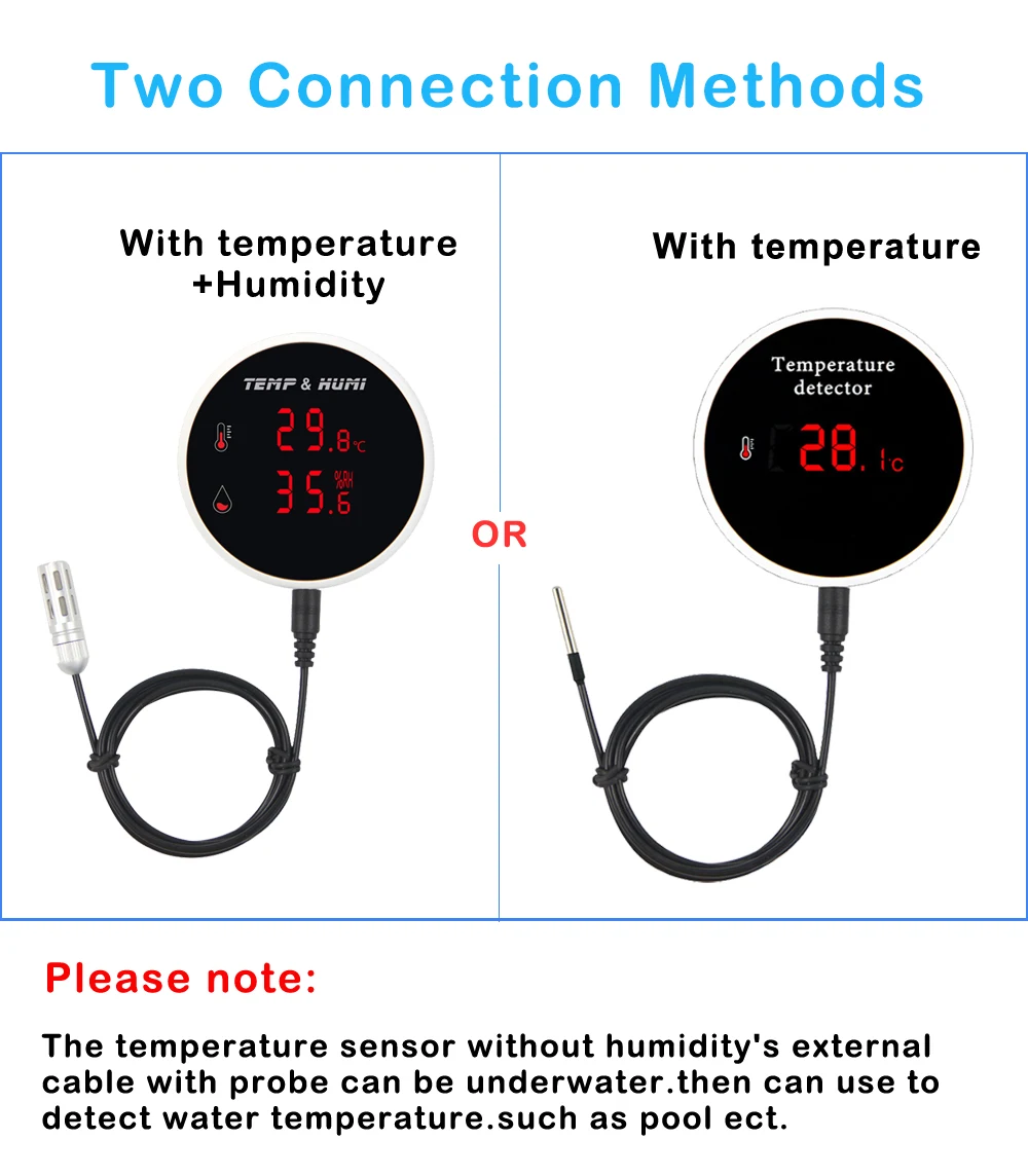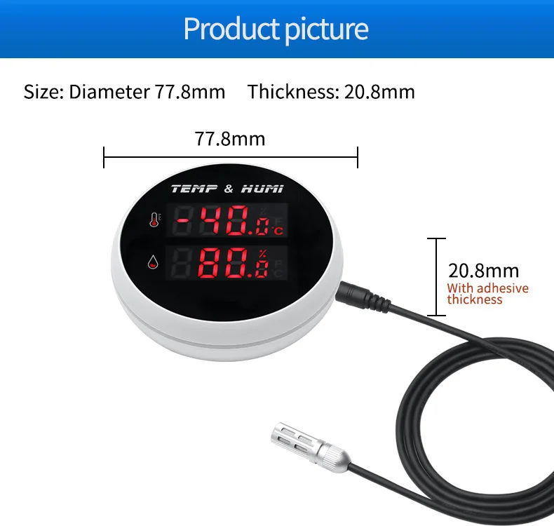 • Его можно использовать в качестве датчика температуры датчика влажности в помещении без добавления зонда, подходит для детской комнаты, квартиры, теплицы, дома на колесах, подвала, гаража и других мест.