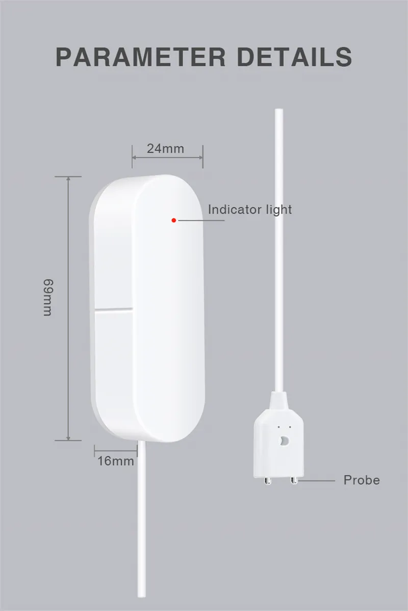 Поместите его в кухню, гостиную или туалет, после обнаружения утечки воды или чрезмерного уровня воды уведомление о тревоге будет отправлено через приложение; Его также можно использовать вместе с другими сигналами тревоги.