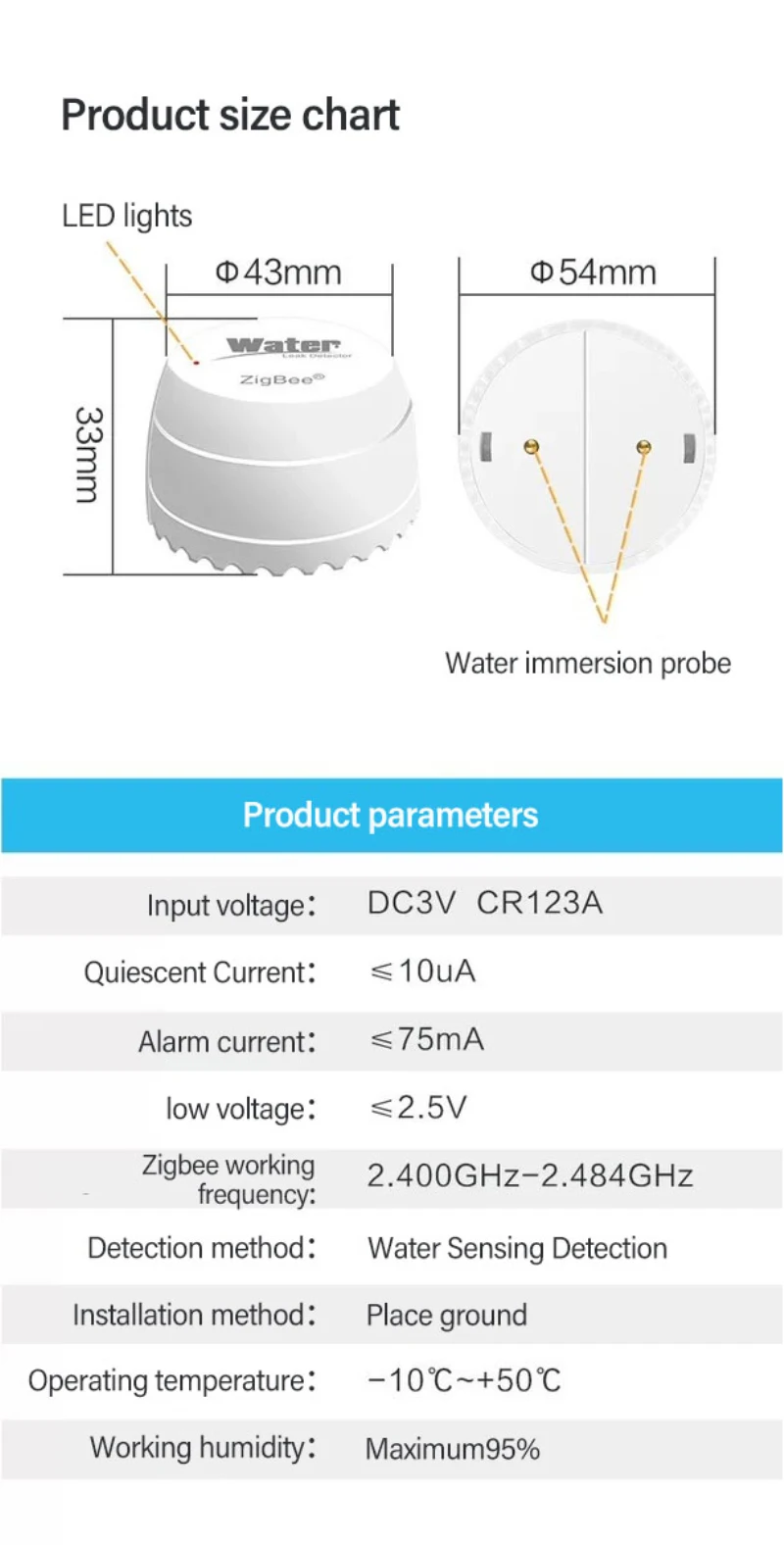 Детектор погружения воды Zigbee использует передовую технологию wirelesstransmission и может использоваться с alarmhost. Когда высота погружения воды достигает 1 мм, два металлических зонда образуют путь, который может быть связан с другими умными продуктами, чтобы отправлять напоминания и принимать своевременные контрмеры, чтобы избежать потерь