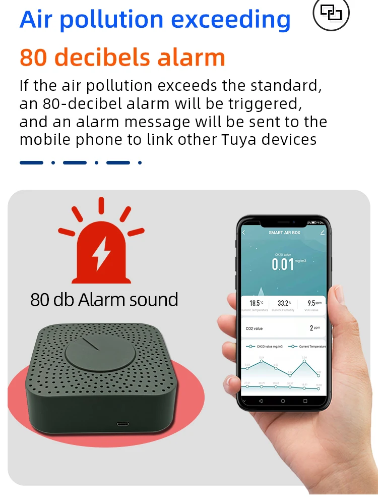 Если загрязнение воздуха превышает стандартное, срабатывает сигнал тревоги в 80 децибел, и на мобильный телефон отправляется тревожное сообщение для подключения других устройств Tuya.