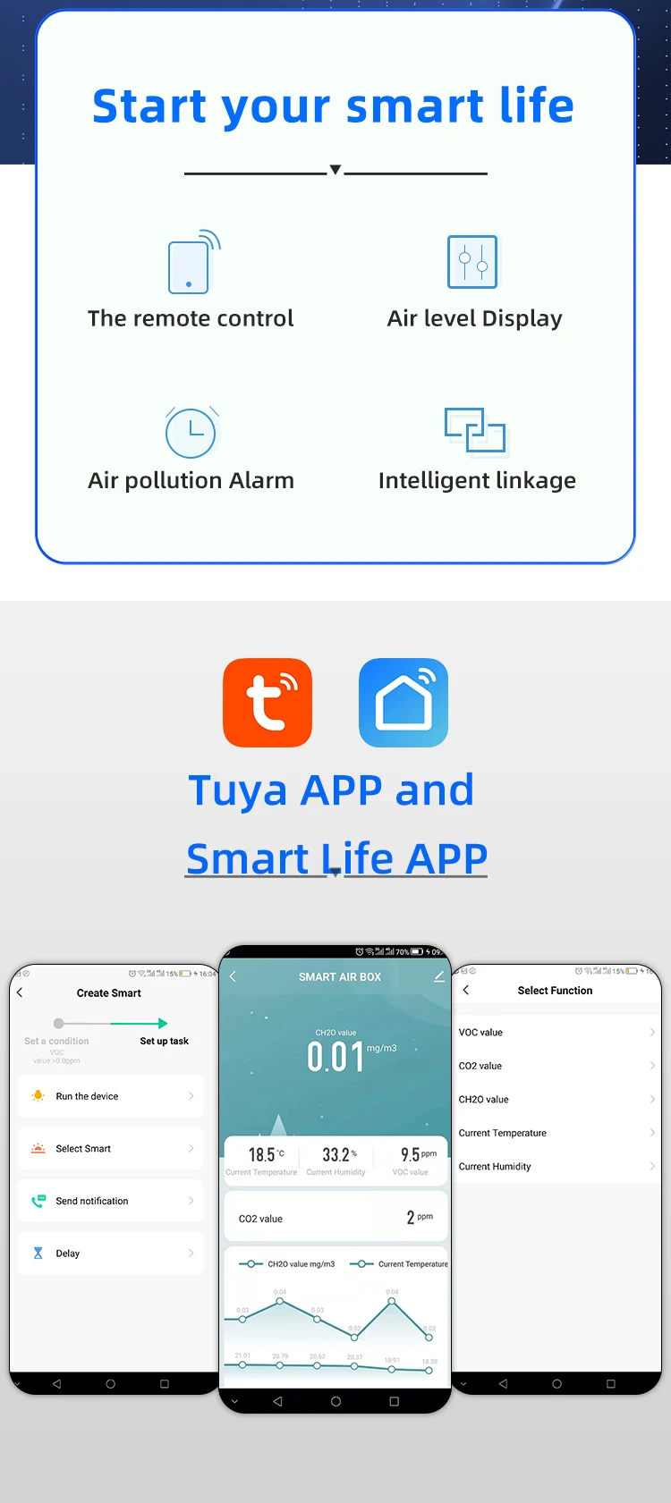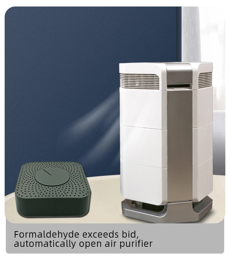 После сопряжения с приложением его можно связать с различными продуктами для умного дома. Например, при обнаружении чрезмерного формальдегида/летучих органических соединений Интеллектуальный очиститель воздуха автоматически включается; при превышении содержания углекислого газа автоматически включается Интеллектуальный вентилятор свежего воздуха; когда температура ненормальная, температура кондиционера автоматически регулируется; Когда влажность слишком низкая или слишком высокая, Умный увлажнитель будет включаться/выключаться автоматически; при обнаружении, что определенный параметр превышает стандарт, на будильник будет отправлено сообщение (вышеуказанная функция интеллектуальной связи должна быть согласована с продуктом для умного дома)