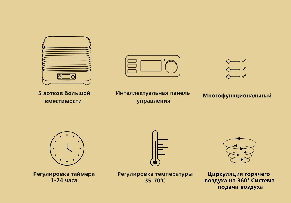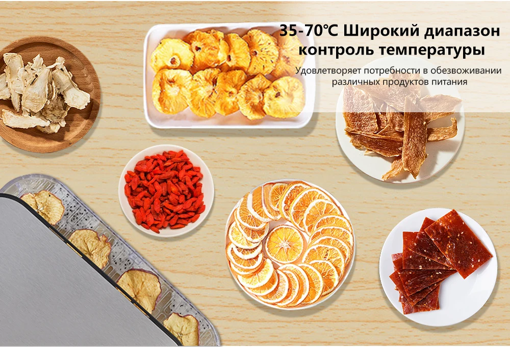 • Таймер и регулировка температуры-функции регулируемого таймера и температурных функций; Температура сушки может быть установлена от 35 ℃-70 ℃, в то время как время может быть установлено от 0-24 часов; выберите оптимальное время и температуру в зависимости от ингредиентов; Вентилятор горячего воздуха автоматически включится и выключится, чтобы сбалансировать температуру;