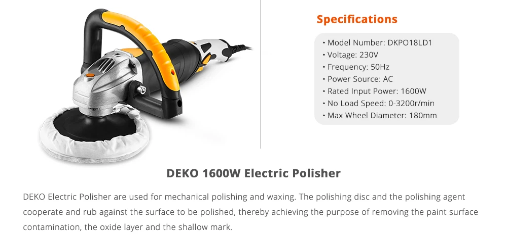 DEKO 220 В 1600 Вт Автоматическая полировальная машинка с переменной скоростью 3200 об / мин 180 мм Электрический полировщик Полировщик автомобилей Инструменты для шлифовки полов