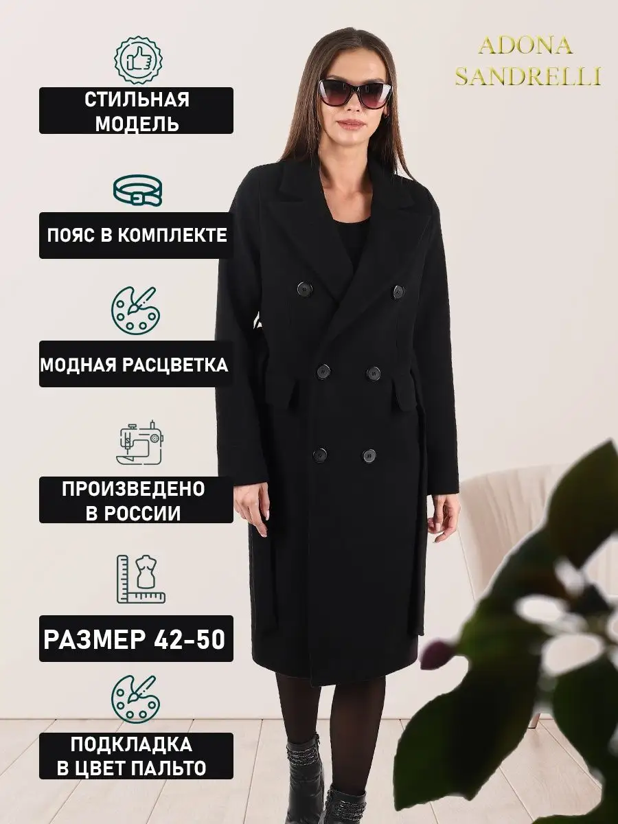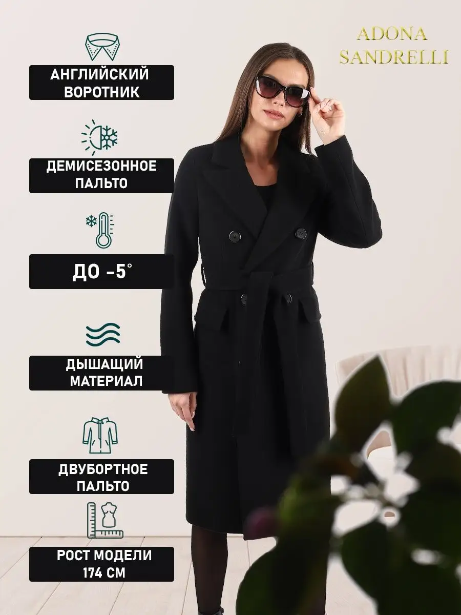 Описание: Пальто двубортное полуприлегающего силуэта с английским воротником. Длина пальто по спинке, для всех размеров 103 см. (+ - 3%). Температурный режим от +10 до -5 градусов. Особенностью модели является дышащий материал. Классическая модель имеет прорезные карманы с клапаном, застежка на пуговицы. Пояс из основной ткани в комплекте, имеются шлевки. Шлица для удобства ходьбы. Модель отлично сочетается с деловым дресс-кодом и востребована всегда. Рост девушки модели 174 см. Дорогие наши покупательницы! Мы, производитель пальто Adona Sandrelli, не торгуем со своего склада. Все наши пальто хранятся на складах WB и уже оттуда отправляются к Вам, на основании заявок от Вас. Мы не задерживаем отправку к Вам наших пальто, так как не можем на это повлиять. При отправке товара мы не путаем наши пальто с чужими товарами, так как у нас нет других товаров, кроме наших пальто. Мы не делаем пересортицу по моделям, размерам и расцветкам пальто, так как мы не формируем отправки к Вам. Мы не производим переупаковку наших пальто на складах WB в комок, замотанный скотчем, так у нас нет доступа к складам WB. Мы не удерживаем с Вас стоимость возвратов, точно так же, как и не выдаём Вам чек о покупке нашего пальто, так как это не мы продали Вам пальто Adona Sandrelli. Мы не теряем наши пояса, потому что перед отправкой в WB наша продукция проходит ОТК. Мы не пачкаем наши пальто перед отправкой. Мы не отрываем пуговицы «с мясом» от наших пальто. Мы не эксплуатируем наши пальто перед отправкой в WB. Надеемся, в случае возникновения проблем, Вы оформите пальто как брак, для изъятия из оборота, иначе оно отправиться к другому покупателю. Для нас важно, чтобы каждая наша покупательница осталась довольна покупкой и собой. Со склада производителя Adona Sandrelli, пальто отправляются в полной комплектации и в идеальном виде - отпаренные и упакованные в запаянные полиэтиленовые чехлы, с индивидуальной вешалкой, в состоянии «получила, надела, ушла с улыбкой».