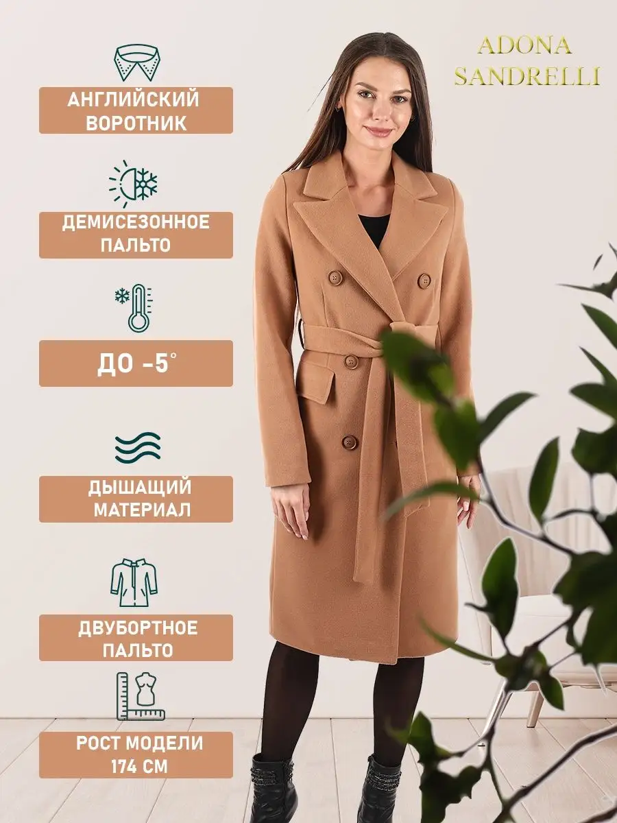 Описание: Пальто двубортное полуприлегающего силуэта с английским воротником. Длина пальто по спинке, для всех размеров 103 см. (+ - 3%). Температурный режим от +10 до -5 градусов. Особенностью модели является дышащий материал. Классическая модель имеет прорезные карманы с клапаном, застежка на пуговицы. Пояс из основной ткани в комплекте, имеются шлевки. Шлица для удобства ходьбы. Модель отлично сочетается с деловым дресс-кодом и востребована всегда. Рост девушки модели 174 см. Дорогие наши покупательницы! Мы, производитель пальто Adona Sandrelli, не торгуем со своего склада. Все наши пальто хранятся на складах WB и уже оттуда отправляются к Вам, на основании заявок от Вас. Мы не задерживаем отправку к Вам наших пальто, так как не можем на это повлиять. При отправке товара мы не путаем наши пальто с чужими товарами, так как у нас нет других товаров, кроме наших пальто. Мы не делаем пересортицу по моделям, размерам и расцветкам пальто, так как мы не формируем отправки к Вам. Мы не производим переупаковку наших пальто на складах WB в комок, замотанный скотчем, так у нас нет доступа к складам WB. Мы не удерживаем с Вас стоимость возвратов, точно так же, как и не выдаём Вам чек о покупке нашего пальто, так как это не мы продали Вам пальто Adona Sandrelli. Мы не теряем наши пояса, потому что перед отправкой в WB наша продукция проходит ОТК. Мы не пачкаем наши пальто перед отправкой. Мы не отрываем пуговицы «с мясом» от наших пальто. Мы не эксплуатируем наши пальто перед отправкой в WB. Надеемся, в случае возникновения проблем, Вы оформите пальто как брак, для изъятия из оборота, иначе оно отправиться к другому покупателю. Для нас важно, чтобы каждая наша покупательница осталась довольна покупкой и собой. Со склада производителя Adona Sandrelli, пальто отправляются в полной комплектации и в идеальном виде - отпаренные и упакованные в запаянные полиэтиленовые чехлы, с индивидуальной вешалкой, в состоянии «получила, надела, ушла с улыбкой».