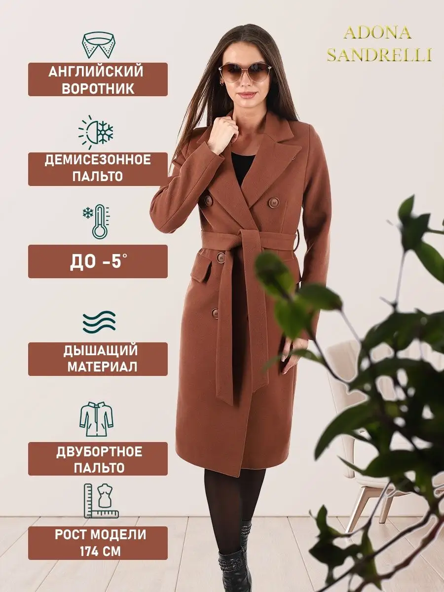 Описание: Пальто двубортное полуприлегающего силуэта с английским воротником. Длина пальто по спинке, для всех размеров 103 см. (+ - 3%). Температурный режим от +10 до -5 градусов. Особенностью модели является дышащий материал. Классическая модель имеет прорезные карманы с клапаном, застежка на пуговицы. Пояс из основной ткани в комплекте, имеются шлевки. Шлица для удобства ходьбы. Модель отлично сочетается с деловым дресс-кодом и востребована всегда. Рост девушки модели 174 см. Дорогие наши покупательницы! Мы, производитель пальто Adona Sandrelli, не торгуем со своего склада. Все наши пальто хранятся на складах WB и уже оттуда отправляются к Вам, на основании заявок от Вас. Мы не задерживаем отправку к Вам наших пальто, так как не можем на это повлиять. При отправке товара мы не путаем наши пальто с чужими товарами, так как у нас нет других товаров, кроме наших пальто. Мы не делаем пересортицу по моделям, размерам и расцветкам пальто, так как мы не формируем отправки к Вам. Мы не производим переупаковку наших пальто на складах WB в комок, замотанный скотчем, так у нас нет доступа к складам WB. Мы не удерживаем с Вас стоимость возвратов, точно так же, как и не выдаём Вам чек о покупке нашего пальто, так как это не мы продали Вам пальто Adona Sandrelli. Мы не теряем наши пояса, потому что перед отправкой в WB наша продукция проходит ОТК. Мы не пачкаем наши пальто перед отправкой. Мы не отрываем пуговицы «с мясом» от наших пальто. Мы не эксплуатируем наши пальто перед отправкой в WB. Надеемся, в случае возникновения проблем, Вы оформите пальто как брак, для изъятия из оборота, иначе оно отправиться к другому покупателю. Для нас важно, чтобы каждая наша покупательница осталась довольна покупкой и собой. Со склада производителя Adona Sandrelli, пальто отправляются в полной комплектации и в идеальном виде - отпаренные и упакованные в запаянные полиэтиленовые чехлы, с индивидуальной вешалкой, в состоянии «получила, надела, ушла с улыбкой».