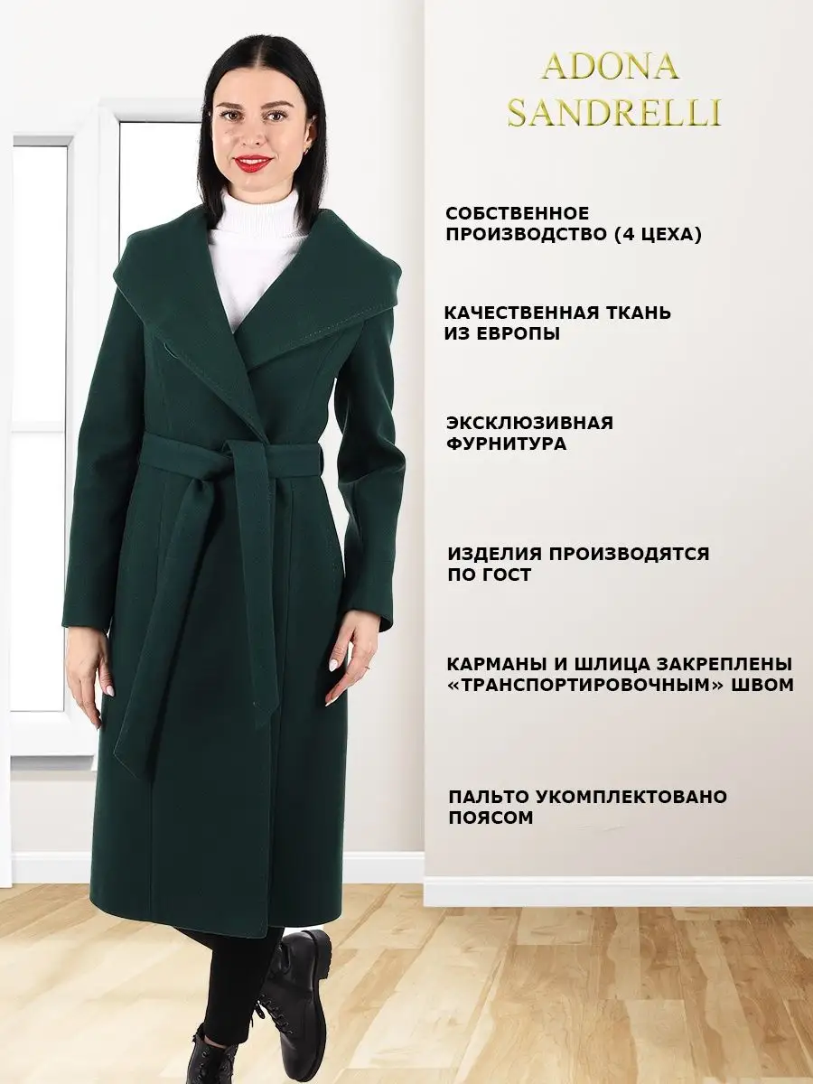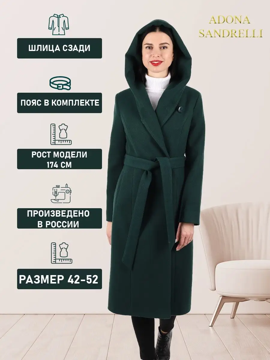 Описание: Стильное женское пальто из драпа приталенного силуэта. Длина пальто по спинке для всех размеров 113 см. (+ - 3%). Температурный режим от от +10 до -5 градусов. Шерстяная ткань мягкая, бархатистая и дышащая. Особенностью этой модели является капюшон, если расстегнуть верхнюю пуговицу на воротнике, получается капюшон "кобра". Капюшон, карманы и пояс пальто декорированы строчкой. Пояс в комплекте. Рост девушек моделей 178-179 см. Дорогие наши покупательницы! Мы, производитель пальто Adona Sandrelli, не торгуем со своего склада. Все наши пальто хранятся на складах WB и уже оттуда отправляются к Вам, на основании заявок от Вас. Мы не задерживаем отправку к Вам наших пальто, так как не можем на это повлиять. При отправке товара мы не путаем наши пальто с чужими товарами, так как у нас нет других товаров, кроме наших пальто. Мы не делаем пересортицу по моделям, размерам и расцветкам пальто, так как мы не формируем отправки к Вам. Мы не производим переупаковку наших пальто на складах WB в комок, замотанный скотчем, так у нас нет доступа к складам WB. Мы не удерживаем с Вас стоимость возвратов, точно так же, как и не выдаём Вам чек о покупке нашего пальто, так как это не мы продали Вам пальто Adona Sandrelli. Мы не теряем наши пояса, потому что перед отправкой в WB наша продукция проходит ОТК. Мы не пачкаем наши пальто перед отправкой. Мы не отрываем пуговицы «с мясом» от наших пальто. Мы не эксплуатируем наши пальто перед отправкой в WB. Надеемся, в случае возникновения проблем, Вы оформите пальто как брак, для изъятия из оборота, или как минимум, напишите обращение в техподдержку WB, иначе оно отправиться к другому покупателю. Для нас важно, чтобы каждая наша покупательница осталась довольна покупкой и собой. Со склада производителя Adona Sandrelli, пальто отправляются в полной комплектации и в идеальном виде - отпаренные и упакованные в запаянные полиэтиленовые чехлы, с индивидуальной вешалкой, в состоянии «получила, надела, ушла с улыбкой».