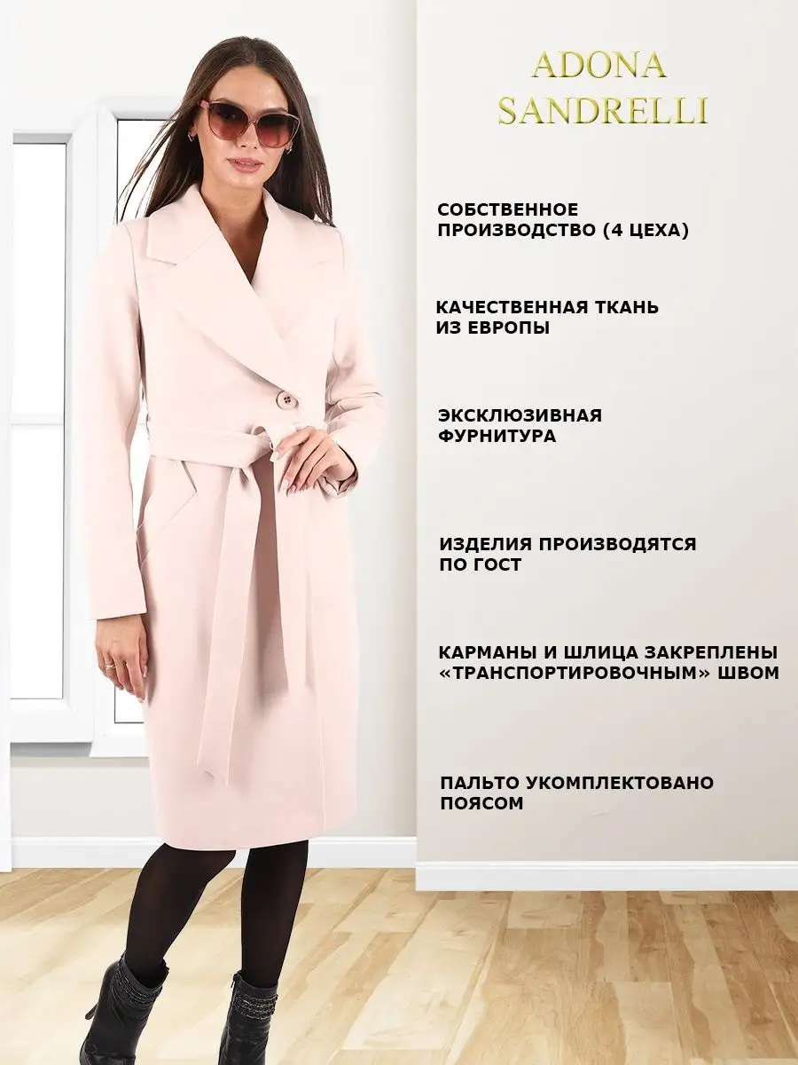 Описание: Представляем вам классическое, демисезонное, модное пальто из нашей последней осенне-весенней коллекции. Это женственное и модное демисезонное однобортное пальто приталенного силуэта без утеплителя и длиной по спинке в 103 см. во всех размерах (+ - 3%). Рекомендуется носить в температурном режиме от +10 до -5 градусов, но это зависит от множества факторов, таких как климатическая зона, уровень активности и физиологические особенности организма. Особенностью этой модели является шерстяная ткань: мягкая, бархатистая и дышащая. При этом втачной рукав создает четкий очертания фигуры и отложной воротник придает дополнительный комфорт. Есть также удобные прорезные карманы. Пальто застегивается на пуговицы в тон основного цвета и потайную застежку, для надежной защиты от холода. В комплекте есть пояс из основной ткани для дополнительной поддержки силуэта. Данная модель пальто специально пошита без шлевок (петелек для пояса), так как данную модель пальто Вы можете носить как с поясом, так и без пояса. Смотря какое у Вас настроение)) Это универсальное и функциональное пальто подходит как для прогулок, так и для офиса или вечеринок. Лаконичный дизайн пальто визуально стройнит и придает шарм. Для тех, кто не любит стандартный размер, доступны большие размеры, а также модель для беременных на ранних сроках. Это демисезонное пальто является непревзойденно привлекательным и идеальным выбором для тех, кто ищет теплую и стильную верхнюю одежду. Ткань из шерсти и функциональный удобный крой также делают его идеальным выбором для осенне-зимнего сезона. Во избежание споров (пальто маломерит, или большемерит) предлагаем всем ознакомиться с нижеприведенной таблицей по размерной сетке (ОГ-ОТ-ОБ): 42-ой размер: ОГ82-86, ОТ62-66, ОБ90-94; 44-ый размер: ОГ86-90, ОТ66-70, ОБ94-98; 46-ой размер: ОГ90-94, ОТ70-74, ОБ98-102; 48-ой размер: ОГ94-98, ОТ74-78, ОБ102-106; 50-ый размер: ОГ98-102, ОТ78-82, ОБ106-110; 52-ой размер: ОГ102-106, ОТ82-86, ОБ110-114; Отличное решение для девушек, желающих выглядеть модно и стильно, не теряя при этом комфорт и тепло. Женское пальто является не только практичным элементом гардероба, но и отличным способом выглядеть стильно и элегантно в любое время года. На фотографиях и видео позируют девушки ростом 170-174 см. Зная свой рост, Вы можете спроектировать длину пальто на себя. Чтобы поддерживать новое состояние пальто, рекомендуется в конце каждого сезона пользоваться услугами химчистки. Дорогие наши покупательницы! Мы, производитель пальто Adona Sandrelli, не торгуем со своего склада. Все наши пальто хранятся на складах WB и уже оттуда отправляются к Вам, на основании заявок от Вас. Мы не задерживаем отправку к Вам наших замечательных пальто, так как не можем на это повлиять. При отправке к Вам наших пальто мы не путаем наши стильные пальто с чужими товарами, так как у нас просто нет других товаров, кроме наших классических пальто. Мы не делаем пересортицу по моделям, размерам и расцветкам пальто, так как мы не формируем отправки к Вам. Мы не производим переупаковку наших пальто на складах WB в комок, замотанный скотчем, так у нас нет доступа к складам WB. Мы не удерживаем с Вас стоимость возвратов, точно так же, как и не выдаём Вам чек о покупке нашего пальто, так как это не мы продали Вам пальто Adona Sandrelli. Мы не теряем наши пояса, потому что перед отправкой в WB наша продукция проходит ОТК. Мы не пачкае