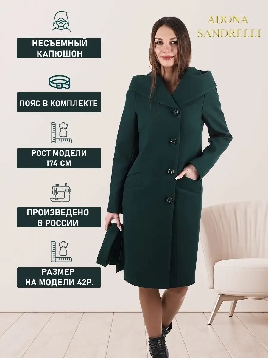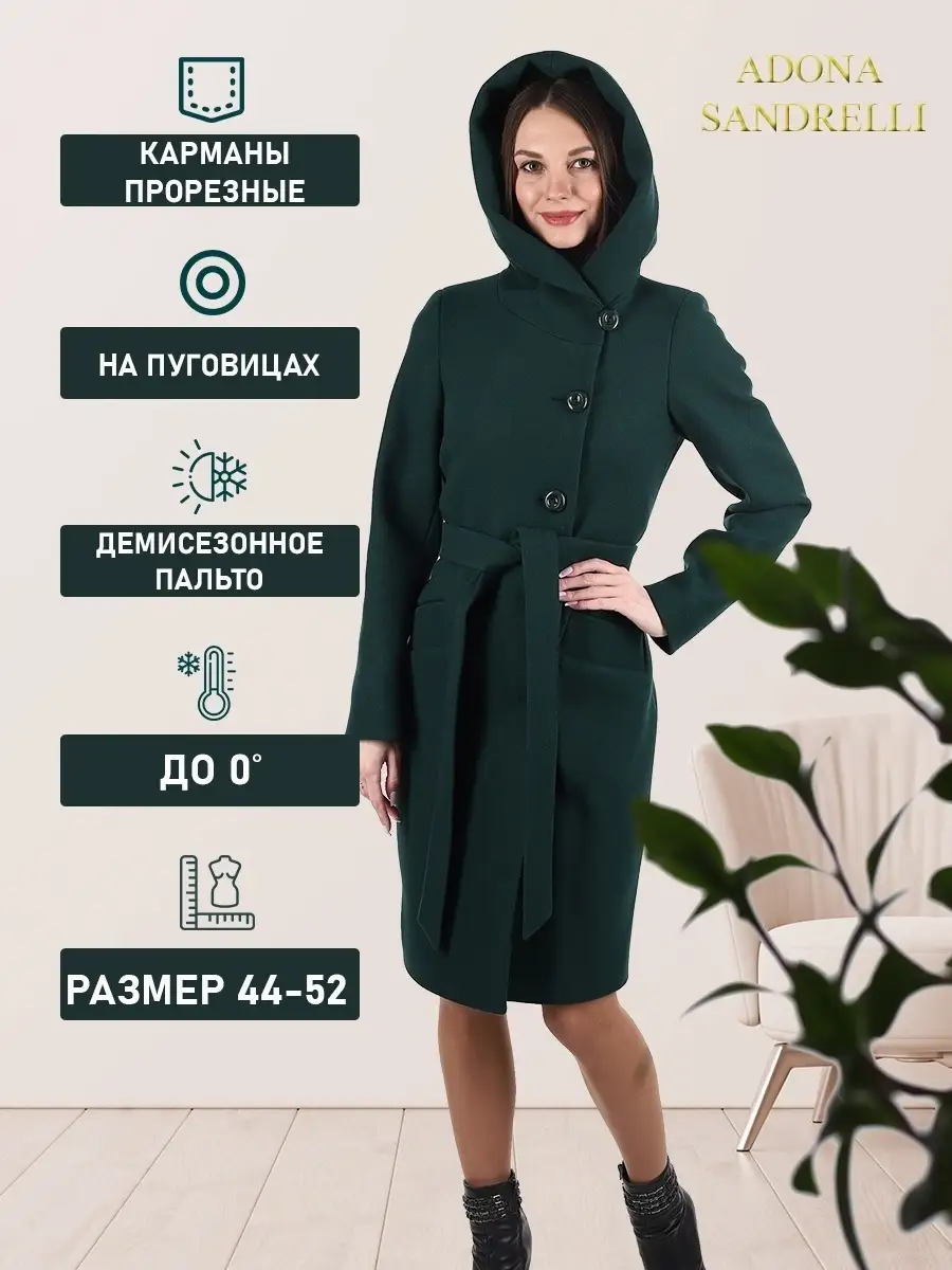 Описание: Представляем Вашему вниманию стильное женское пальто из новой коллекции Adona Sandrelli - демисезонное пальто, идеально подходящее для осени и весны. Это модное современное пальто прямого силуэта - универсальная модель, которая способна придать женственности и шарма даже самому обычному образу. Длина пальто по спинке для всех размеров составляет 101 см. (+ - 3%), а температурный режим позволяет носить его при температуре от +10 до -5 градусов. Температурный режим зависит от многих факторов (климатическая зона, ветровая нагрузка в данный момент, влажность, уровень Вашей активности, физиологические особенности организма, дополнительная одежда) и носит рекомендательный характер. Обратите внимание, что температурный режим зависит от индивидуальной восприимчивости к холоду и от Вашего теплообмена. Особенностью этой модели является несъемный капюшон, который позволяет менять образ и подстраиваться под разные погодные условия. Он позволяет менять образ и подстраиваться под разные погодные условия. Застегивается на пуговицы в тон пальто. Прорезные карманы украшены широкой листочкой, которая придает модели особый шарм. Пальто имеет пояс из основной ткани, который красиво подчеркивает талию. Застегивается пальто на пуговицы в один цвет с пальто, создавая эффект единого целого. Это демисезонное женское пальто доступно в больших размерах и идеально подходит для молодежной и современной коллекции. Оно также подходит для беременных на ранних сроках. Пальто сделано из шерстяной ткани, что обеспечивает тепло и комфорт в непогоду. Прекрасно сочетается с вашим осенне-зимним гардеробом. Модель придумана для Вашего удобства и комфорта, идеально подходит как на повседневных прогулках по городу, так и на деловых встречах. Пальто на рекламных фотографиях представлено в двух вариантах стиля: классическом и повседневном, Вы можете самостоятельно выбрать свой образ. Рост девушек моделей на фото и видео составляет 170-174 см. Зная свой рост, Вы можете спроектировать длину пальто на себя. Это модное пальто станет прекрасным дополнением к вашему осенне-зимнему гардеробу. Чтобы поддерживать новое состояние пальто, рекомендуется в конце каждого сезона пользоваться услугами химчистки. Это теплое, универсальное и функциональное пальто пошито и в больших размерах, до 52-го размера включительно. Во избежание споров (пальто маломерит, или большемерит) предлагаем всем ознакомиться с нижеприведенной таблицей по размерной сетке (ОГ-ОТ-ОБ): 42-ой размер: ОГ82-86, ОТ62-66, ОБ90-94; 44-ый размер: ОГ86-90, ОТ66-70, ОБ94-98; 46-ой размер: ОГ90-94, ОТ70-74, ОБ98-102; 48-ой размер: ОГ94-98, ОТ74-78, ОБ102-106; 50-ый размер: ОГ98-102, ОТ78-82, ОБ106-110; 52-ой размер: ОГ102-106, ОТ82-86, ОБ110-114. Непревзойденная и привлекательная верхняя одежда, которую можно надеть как на прогулку, так и в офисе, на встречу, свидание или на вечеринку. Карманы и подкладка, качество и дизайн - каждый элемент проработан до совершенства. Это модное, современное и молодежное пальто, которое станет прекрасным дополнением к вашему гардеробу. Дорогие наши покупательницы! Мы, производитель пальто Adona Sandrelli, не торгуем со своего склада. Все наши пальто хранятся на складах WB и уже оттуда отправляются к Вам, на основании заявок от Вас. Мы не задерживаем отправку к Вам наших замечательных пальто, так как не можем на это повлиять. При отправке к Вам наших пальт