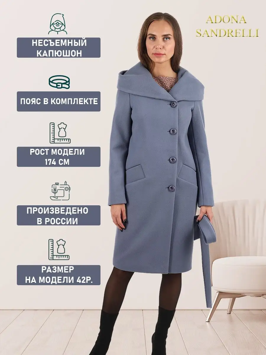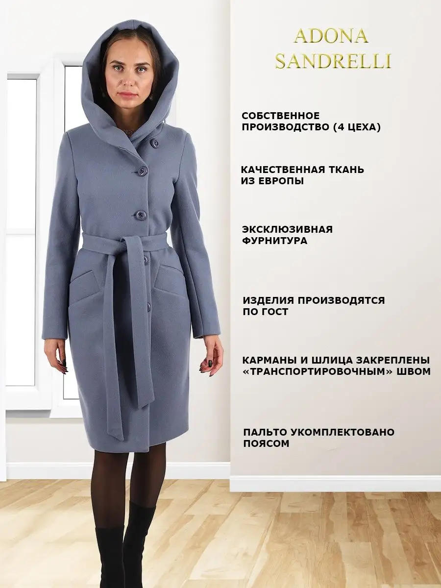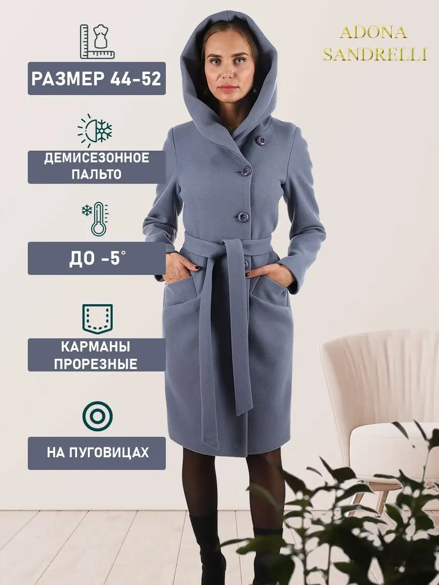 Описание: Представляем Вашему вниманию стильное женское пальто из новой коллекции Adona Sandrelli - демисезонное пальто, идеально подходящее для осени и весны. Это модное современное пальто прямого силуэта - универсальная модель, которая способна придать женственности и шарма даже самому обычному образу. Длина пальто по спинке для всех размеров составляет 101 см. (+ - 3%), а температурный режим позволяет носить его при температуре от +10 до -5 градусов. Температурный режим зависит от многих факторов (климатическая зона, ветровая нагрузка в данный момент, влажность, уровень Вашей активности, физиологические особенности организма, дополнительная одежда) и носит рекомендательный характер. Обратите внимание, что температурный режим зависит от индивидуальной восприимчивости к холоду и от Вашего теплообмена. Особенностью этой модели является несъемный капюшон, который позволяет менять образ и подстраиваться под разные погодные условия. Он позволяет менять образ и подстраиваться под разные погодные условия. Застегивается на пуговицы в тон пальто. Прорезные карманы украшены широкой листочкой, которая придает модели особый шарм. Пальто имеет пояс из основной ткани, который красиво подчеркивает талию. Застегивается пальто на пуговицы в один цвет с пальто, создавая эффект единого целого. Это демисезонное женское пальто доступно в больших размерах и идеально подходит для молодежной и современной коллекции. Оно также подходит для беременных на ранних сроках. Пальто сделано из шерстяной ткани, что обеспечивает тепло и комфорт в непогоду. Прекрасно сочетается с вашим осенне-зимним гардеробом. Модель придумана для Вашего удобства и комфорта, идеально подходит как на повседневных прогулках по городу, так и на деловых встречах. Пальто на рекламных фотографиях представлено в двух вариантах стиля: классическом и повседневном, Вы можете самостоятельно выбрать свой образ. Рост девушек моделей на фото и видео составляет 170-174 см. Зная свой рост, Вы можете спроектировать длину пальто на себя. Это модное пальто станет прекрасным дополнением к вашему осенне-зимнему гардеробу. Чтобы поддерживать новое состояние пальто, рекомендуется в конце каждого сезона пользоваться услугами химчистки. Это теплое, универсальное и функциональное пальто пошито и в больших размерах, до 52-го размера включительно. Во избежание споров (пальто маломерит, или большемерит) предлагаем всем ознакомиться с нижеприведенной таблицей по размерной сетке (ОГ-ОТ-ОБ): 42-ой размер: ОГ82-86, ОТ62-66, ОБ90-94; 44-ый размер: ОГ86-90, ОТ66-70, ОБ94-98; 46-ой размер: ОГ90-94, ОТ70-74, ОБ98-102; 48-ой размер: ОГ94-98, ОТ74-78, ОБ102-106; 50-ый размер: ОГ98-102, ОТ78-82, ОБ106-110; 52-ой размер: ОГ102-106, ОТ82-86, ОБ110-114. Непревзойденная и привлекательная верхняя одежда, которую можно надеть как на прогулку, так и в офисе, на встречу, свидание или на вечеринку. Карманы и подкладка, качество и дизайн - каждый элемент проработан до совершенства. Это модное, современное и молодежное пальто, которое станет прекрасным дополнением к вашему гардеробу. Дорогие наши покупательницы! Мы, производитель пальто Adona Sandrelli, не торгуем со своего склада. Все наши пальто хранятся на складах WB и уже оттуда отправляются к Вам, на основании заявок от Вас. Мы не задерживаем отправку к Вам наших замечательных пальто, так как не можем на это повлиять. При отправке к Вам наших пальт