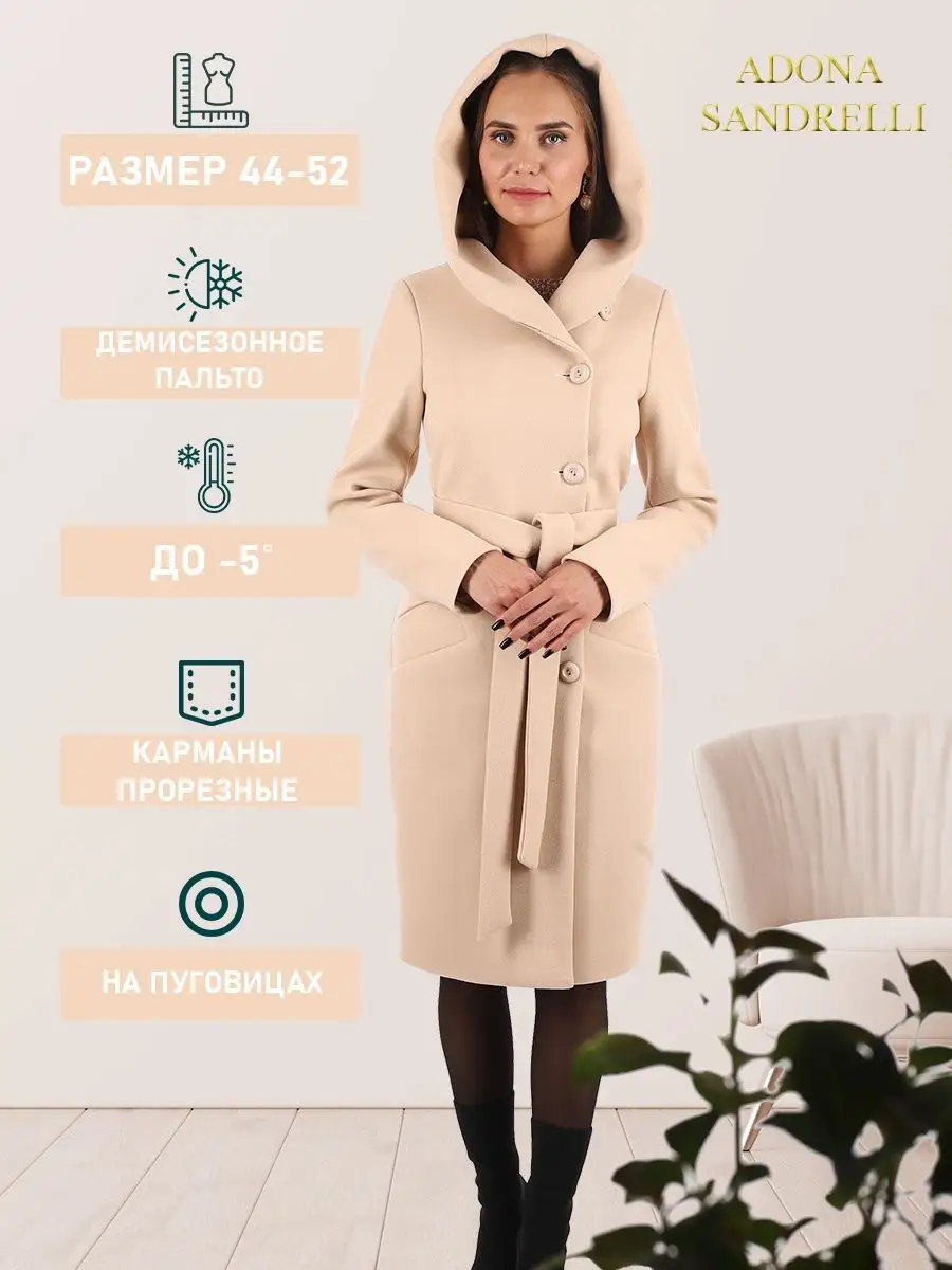 Описание: Представляем Вашему вниманию стильное женское пальто из новой коллекции Adona Sandrelli - демисезонное пальто, идеально подходящее для осени и весны. Это модное современное пальто прямого силуэта - универсальная модель, которая способна придать женственности и шарма даже самому обычному образу. Длина пальто по спинке для всех размеров составляет 101 см. (+ - 3%), а температурный режим позволяет носить его при температуре от +10 до -5 градусов. Температурный режим зависит от многих факторов (климатическая зона, ветровая нагрузка в данный момент, влажность, уровень Вашей активности, физиологические особенности организма, дополнительная одежда) и носит рекомендательный характер. Обратите внимание, что температурный режим зависит от индивидуальной восприимчивости к холоду и от Вашего теплообмена. Особенностью этой модели является несъемный капюшон, который позволяет менять образ и подстраиваться под разные погодные условия. Он позволяет менять образ и подстраиваться под разные погодные условия. Застегивается на пуговицы в тон пальто. Прорезные карманы украшены широкой листочкой, которая придает модели особый шарм. Пальто имеет пояс из основной ткани, который красиво подчеркивает талию. Застегивается пальто на пуговицы в один цвет с пальто, создавая эффект единого целого. Это демисезонное женское пальто доступно в больших размерах и идеально подходит для молодежной и современной коллекции. Оно также подходит для беременных на ранних сроках. Пальто сделано из шерстяной ткани, что обеспечивает тепло и комфорт в непогоду. Прекрасно сочетается с вашим осенне-зимним гардеробом. Модель придумана для Вашего удобства и комфорта, идеально подходит как на повседневных прогулках по городу, так и на деловых встречах. Пальто на рекламных фотографиях представлено в двух вариантах стиля: классическом и повседневном, Вы можете самостоятельно выбрать свой образ. Рост девушек моделей на фото и видео составляет 170-174 см. Зная свой рост, Вы можете спроектировать длину пальто на себя. Это модное пальто станет прекрасным дополнением к вашему осенне-зимнему гардеробу. Чтобы поддерживать новое состояние пальто, рекомендуется в конце каждого сезона пользоваться услугами химчистки. Это теплое, универсальное и функциональное пальто пошито и в больших размерах, до 52-го размера включительно. Во избежание споров (пальто маломерит, или большемерит) предлагаем всем ознакомиться с нижеприведенной таблицей по размерной сетке (ОГ-ОТ-ОБ): 42-ой размер: ОГ82-86, ОТ62-66, ОБ90-94; 44-ый размер: ОГ86-90, ОТ66-70, ОБ94-98; 46-ой размер: ОГ90-94, ОТ70-74, ОБ98-102; 48-ой размер: ОГ94-98, ОТ74-78, ОБ102-106; 50-ый размер: ОГ98-102, ОТ78-82, ОБ106-110; 52-ой размер: ОГ102-106, ОТ82-86, ОБ110-114. Непревзойденная и привлекательная верхняя одежда, которую можно надеть как на прогулку, так и в офисе, на встречу, свидание или на вечеринку. Карманы и подкладка, качество и дизайн - каждый элемент проработан до совершенства. Это модное, современное и молодежное пальто, которое станет прекрасным дополнением к вашему гардеробу. Дорогие наши покупательницы! Мы, производитель пальто Adona Sandrelli, не торгуем со своего склада. Все наши пальто хранятся на складах WB и уже оттуда отправляются к Вам, на основании заявок от Вас. Мы не задерживаем отправку к Вам наших замечательных пальто, так как не можем на это повлиять. При отправке к Вам наших пальт