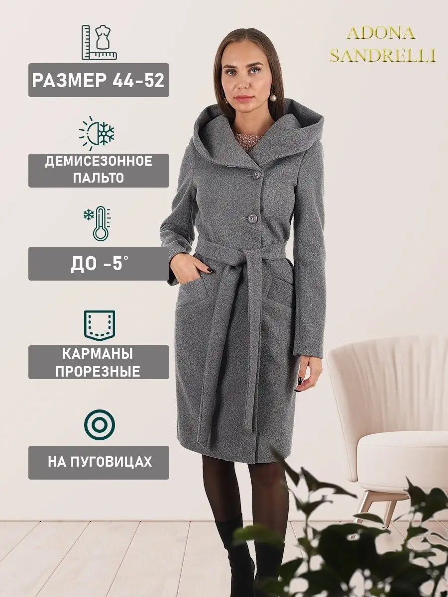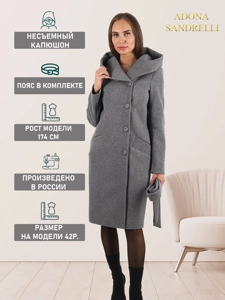 Описание: Представляем Вашему вниманию стильное женское пальто из новой коллекции Adona Sandrelli - демисезонное пальто, идеально подходящее для осени и весны. Это модное современное пальто прямого силуэта - универсальная модель, которая способна придать женственности и шарма даже самому обычному образу. Длина пальто по спинке для всех размеров составляет 101 см. (+ - 3%), а температурный режим позволяет носить его при температуре от +10 до -5 градусов. Температурный режим зависит от многих факторов (климатическая зона, ветровая нагрузка в данный момент, влажность, уровень Вашей активности, физиологические особенности организма, дополнительная одежда) и носит рекомендательный характер. Обратите внимание, что температурный режим зависит от индивидуальной восприимчивости к холоду и от Вашего теплообмена. Особенностью этой модели является несъемный капюшон, который позволяет менять образ и подстраиваться под разные погодные условия. Он позволяет менять образ и подстраиваться под разные погодные условия. Застегивается на пуговицы в тон пальто. Прорезные карманы украшены широкой листочкой, которая придает модели особый шарм. Пальто имеет пояс из основной ткани, который красиво подчеркивает талию. Застегивается пальто на пуговицы в один цвет с пальто, создавая эффект единого целого. Это демисезонное женское пальто доступно в больших размерах и идеально подходит для молодежной и современной коллекции. Оно также подходит для беременных на ранних сроках. Пальто сделано из шерстяной ткани, что обеспечивает тепло и комфорт в непогоду. Прекрасно сочетается с вашим осенне-зимним гардеробом. Модель придумана для Вашего удобства и комфорта, идеально подходит как на повседневных прогулках по городу, так и на деловых встречах. Пальто на рекламных фотографиях представлено в двух вариантах стиля: классическом и повседневном, Вы можете самостоятельно выбрать свой образ. Рост девушек моделей на фото и видео составляет 170-174 см. Зная свой рост, Вы можете спроектировать длину пальто на себя. Это модное пальто станет прекрасным дополнением к вашему осенне-зимнему гардеробу. Чтобы поддерживать новое состояние пальто, рекомендуется в конце каждого сезона пользоваться услугами химчистки. Это теплое, универсальное и функциональное пальто пошито и в больших размерах, до 52-го размера включительно. Во избежание споров (пальто маломерит, или большемерит) предлагаем всем ознакомиться с нижеприведенной таблицей по размерной сетке (ОГ-ОТ-ОБ): 42-ой размер: ОГ82-86, ОТ62-66, ОБ90-94; 44-ый размер: ОГ86-90, ОТ66-70, ОБ94-98; 46-ой размер: ОГ90-94, ОТ70-74, ОБ98-102; 48-ой размер: ОГ94-98, ОТ74-78, ОБ102-106; 50-ый размер: ОГ98-102, ОТ78-82, ОБ106-110; 52-ой размер: ОГ102-106, ОТ82-86, ОБ110-114. Непревзойденная и привлекательная верхняя одежда, которую можно надеть как на прогулку, так и в офисе, на встречу, свидание или на вечеринку. Карманы и подкладка, качество и дизайн - каждый элемент проработан до совершенства. Это модное, современное и молодежное пальто, которое станет прекрасным дополнением к вашему гардеробу. Дорогие наши покупательницы! Мы, производитель пальто Adona Sandrelli, не торгуем со своего склада. Все наши пальто хранятся на складах WB и уже оттуда отправляются к Вам, на основании заявок от Вас. Мы не задерживаем отправку к Вам наших замечательных пальто, так как не можем на это повлиять. При отправке к Вам наших пальт