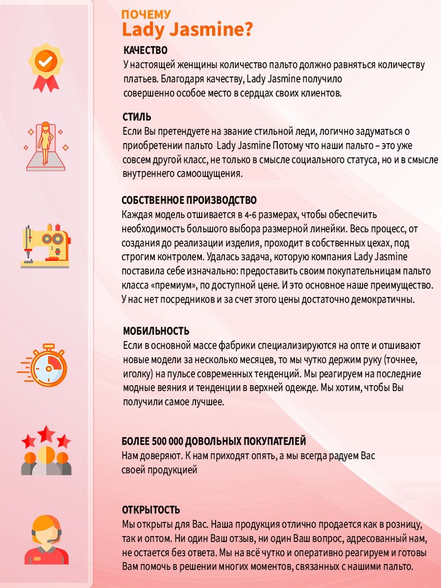 Описание: Представляем вам классическое, демисезонное, модное пальто из нашей последней осенне-весенней коллекции. Женское прямое пальто - необходимая вещь в демисезонной коллекции. Оно является универсальным и замечательным выбором для осенне-весеннего периода. Это модное и современное пальто очаровывает своим элегантным дизайном. Материал, из которого сделано пальто, это прочный и теплый текстиль, который идеально подходит для теплых дней весны, осени и зимы, поэтому пальто обеспечивает тепло и удобство в носке при температурном режиме от +10 до -5 градусов. Обратите внимание, что температурный режим зависит от многих факторов (климатическая зона, ветровая нагрузка в данный момент, влажность, уровень Вашей активности, физиологические особенности организма, дополнительная одежда), так же и от индивидуальной восприимчивости к холоду и от Вашего теплообмена. Вы можете регулировать уровень теплоты и комфорта с помощью промежуточных слоев верхней одежды. Прекрасный английский воротник и втачные рукава придают возможность использования этого пальто в качестве идеальной верхней одежды. Кроме того, это пальто прекрасно сочетается с различными видами верхней одежды и создает чувство комфорта и уверенности в себе. Дополнительное преимущество пальто заключается в функциональности данной модели пальто. Пальто длиной 121 см. по спинке, для всех размеров (+ - 3%), предоставляет комфорт для девушек любого роста. Кнопки и супатная застёжка облегчают быстрое застегивание пальто. Для добавления стиля и комфорта пальто дополнено поясом в тон пальто. Кроме того, для удобства ходьбы предусмотрены боковые швы с разрезами. Во избежание споров (пальто маломерит, или большемерит) предлагаем всем ознакомиться с нижеприведенной таблицей по размерной сетке (ОГ-ОТ-ОБ): 42-ой размер: ОГ82-86, ОТ62-66, ОБ90-94; 44-ый размер: ОГ86-90, ОТ66-70, ОБ94-98; 46-ой размер: ОГ90-94, ОТ70-74, ОБ98-102; 48-ой размер: ОГ94-98, ОТ74-78, ОБ102-106; 50-ый размер: ОГ98-102, ОТ78-82, ОБ106-110; Это классическое пальто удачно сочетается с различными образами, идеально подходит как для молодежных, так и для более зрелых женщин, а также для беременных на ранних сроках. Будьте уверены, что в этом пальто вы будете выглядеть непревзойденно и привлекательно, как на прогулке, так и в офисе или на вечеринке. Независимо от вашего стиля, это пальто будет актуальным, практичным и привлекательным дополнением к вашему гардеробу! На фотографиях и видео позируют девушки ростом 174 см. Дорогие наши покупательницы! Мы, производитель пальто Lady Jasmine, не торгуем со своего склада. Все наши пальто хранятся на складах WB и уже оттуда отправляются к Вам, на основании заявок от Вас. Мы не задерживаем отправку к Вам наших замечательных пальто, так как не можем на это повлиять. При отправке к Вам наших пальто мы не путаем наши стильные пальто с чужими товарами, так как у нас просто нет других товаров, кроме наших классических пальто. Мы не делаем пересортицу по моделям, размерам и расцветкам пальто, так как мы не формируем отправки к Вам. Мы не производим переупаковку наших пальто на складах WB в комок, замотанный скотчем, так у нас нет доступа к складам WB. Мы не удерживаем с Вас стоимость возвратов, точно так же, как и не выдаём Вам чек о покупке нашего пальто, так как это не мы продали Вам пальто Lady Jasmine. Мы не теряем наши пояса, потому что перед отправкой в WB н
