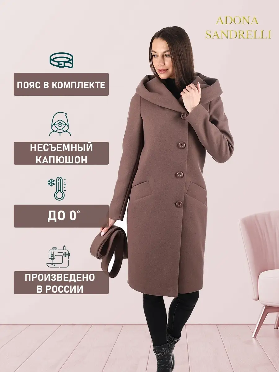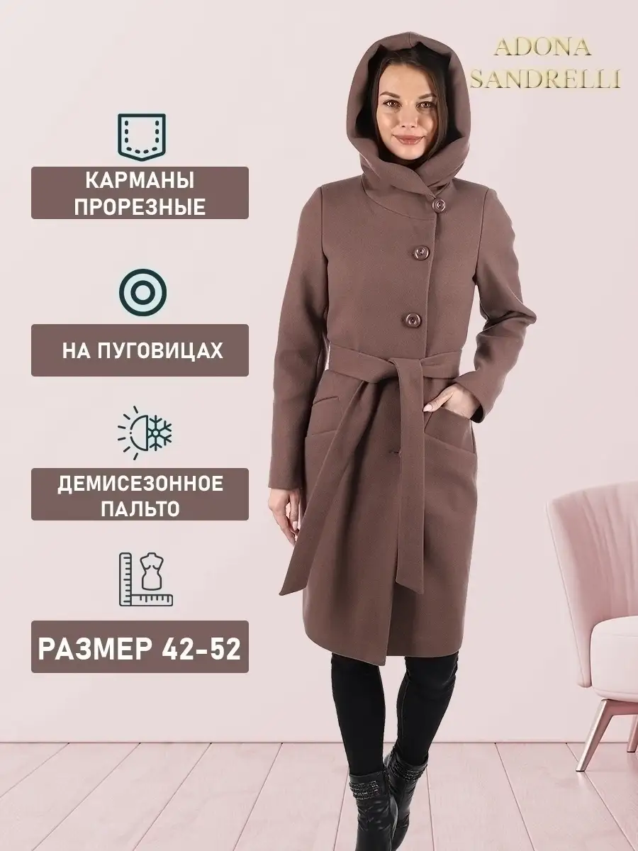 Описание: Представляем Вашему вниманию стильное женское пальто из новой коллекции Adona Sandrelli - демисезонное пальто, идеально подходящее для осени и весны. Это модное современное пальто прямого силуэта - универсальная модель, которая способна придать женственности и шарма даже самому обычному образу. Длина пальто по спинке для всех размеров составляет 101 см. (+ - 3%), а температурный режим позволяет носить его при температуре от +10 до -5 градусов. Температурный режим зависит от многих факторов (климатическая зона, ветровая нагрузка в данный момент, влажность, уровень Вашей активности, физиологические особенности организма, дополнительная одежда) и носит рекомендательный характер. Обратите внимание, что температурный режим зависит от индивидуальной восприимчивости к холоду и от Вашего теплообмена. Особенностью этой модели является несъемный капюшон, который позволяет менять образ и подстраиваться под разные погодные условия. Он позволяет менять образ и подстраиваться под разные погодные условия. Застегивается на пуговицы в тон пальто. Прорезные карманы украшены широкой листочкой, которая придает модели особый шарм. Пальто имеет пояс из основной ткани, который красиво подчеркивает талию. Застегивается пальто на пуговицы в один цвет с пальто, создавая эффект единого целого. Это демисезонное женское пальто доступно в больших размерах и идеально подходит для молодежной и современной коллекции. Оно также подходит для беременных на ранних сроках. Пальто сделано из шерстяной ткани, что обеспечивает тепло и комфорт в непогоду. Прекрасно сочетается с вашим осенне-зимним гардеробом. Модель придумана для Вашего удобства и комфорта, идеально подходит как на повседневных прогулках по городу, так и на деловых встречах. Пальто на рекламных фотографиях представлено в двух вариантах стиля: классическом и повседневном, Вы можете самостоятельно выбрать свой образ. Рост девушек моделей на фото и видео составляет 170-174 см. Зная свой рост, Вы можете спроектировать длину пальто на себя. Это модное пальто станет прекрасным дополнением к вашему осенне-зимнему гардеробу. Чтобы поддерживать новое состояние пальто, рекомендуется в конце каждого сезона пользоваться услугами химчистки. Это теплое, универсальное и функциональное пальто пошито и в больших размерах, до 52-го размера включительно. Во избежание споров (пальто маломерит, или большемерит) предлагаем всем ознакомиться с нижеприведенной таблицей по размерной сетке (ОГ-ОТ-ОБ): 42-ой размер: ОГ82-86, ОТ62-66, ОБ90-94; 44-ый размер: ОГ86-90, ОТ66-70, ОБ94-98; 46-ой размер: ОГ90-94, ОТ70-74, ОБ98-102; 48-ой размер: ОГ94-98, ОТ74-78, ОБ102-106; 50-ый размер: ОГ98-102, ОТ78-82, ОБ106-110; 52-ой размер: ОГ102-106, ОТ82-86, ОБ110-114. Непревзойденная и привлекательная верхняя одежда, которую можно надеть как на прогулку, так и в офисе, на встречу, свидание или на вечеринку. Карманы и подкладка, качество и дизайн - каждый элемент проработан до совершенства. Это модное, современное и молодежное пальто, которое станет прекрасным дополнением к вашему гардеробу. Дорогие наши покупательницы! Мы, производитель пальто Adona Sandrelli, не торгуем со своего склада. Все наши пальто хранятся на складах WB и уже оттуда отправляются к Вам, на основании заявок от Вас. Мы не задерживаем отправку к Вам наших замечательных пальто, так как не можем на это повлиять. При отправке к Вам наших пальт