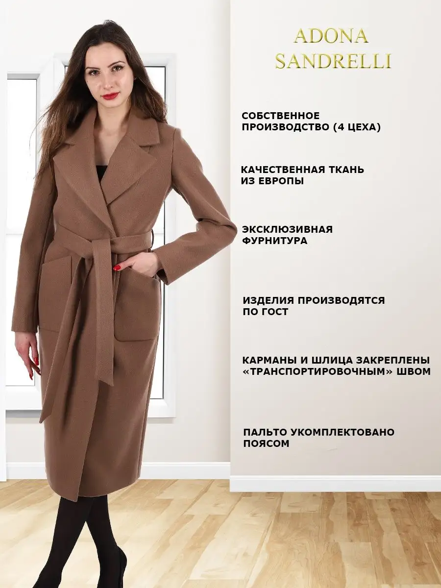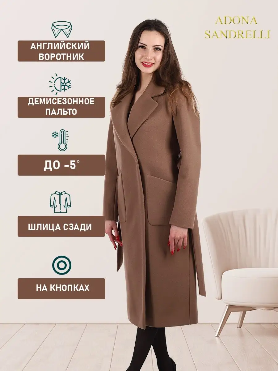 Описание: Представляем вам модное женское пальто из нашей осенне-весенней коллекции. Это современное, стильное пальто с прямым приталенным кроем, выполненное из теплого шерстяного материала. Оно идеально подойдет для прохладных осенних и весенних дней, прекрасно защищая от холода и ветра. Это пальто имеет длину 113 см для всех размеров и температурный режим от +10 до -5 градусов, что позволяет носить его в различные погодные условия. Обратите внимание, что температурный режим зависит от многих факторов (климатическая зона, ветровая нагрузка в данный момент, влажность, уровень Вашей активности, физиологические особенности организма, дополнительная одежда), так же и от индивидуальной восприимчивости к холоду и от Вашего теплообмена. Вы можете регулировать уровень теплоты и комфорта с помощью промежуточных слоев верхней одежды. Застежка на кнопках обеспечивает надежную фиксацию, а втачные рукава и закругленные накладные карманы придают пальто дополнительный комфорт и практичность. В комплекте с пальто идет пояс из основной ткани с шлевками, который позволяет подчеркнуть талию и создать эффектную силуэтную линию. Также можно носить пальто без пояса, что будет отлично сочетаться с большими размерами и подходит для беременных на ранних сроках. Это длинное, короткое пальто - идеальный выбор для тех, кто ценит комфорт, качество и стиль. Будьте уверены, что в этом пальто вы будете выглядеть непревзойденно и привлекательно, как на прогулке, так и в офисе или на вечеринке. Для фотографий позируют девушки ростом 174 см. Дорогие наши покупательницы! Мы, производитель пальто Adona Sandrelli, не торгуем со своего склада. Все наши пальто хранятся на складах WB и уже оттуда отправляются к Вам, на основании заявок от Вас. Мы не задерживаем отправку к Вам наших пальто, так как не можем на это повлиять. При отправке товара мы не путаем наши пальто с чужими товарами, так как у нас нет других товаров, кроме наших пальто. Мы не делаем пересортицу по моделям, размерам и расцветкам пальто, так как мы не формируем отправки к Вам. Мы не производим переупаковку наших пальто на складах WB в комок, замотанный скотчем, так у нас нет доступа к складам WB. Мы не удерживаем с Вас стоимость возвратов, точно так же, как и не выдаём Вам чек о покупке нашего пальто, так как это не мы продали Вам пальто Adona Sandrelli. Мы не теряем наши пояса, потому что перед отправкой в WB наша продукция проходит ОТК. Мы не пачкаем наши пальто перед отправкой. Мы не отрываем пуговицы «с мясом» от наших пальто. Мы не эксплуатируем наши пальто перед отправкой в WB. Надеемся, в случае возникновения проблем, Вы оформите пальто как брак, для изъятия из оборота, иначе оно отправиться к другому покупателю. Для нас важно, чтобы каждая наша покупательница осталась довольна покупкой и собой. Со склада производителя Adona Sandrelli, пальто отправляются в полной комплектации и в идеальном виде - отпаренные и упакованные в запаянные полиэтиленовые чехлы, с индивидуальной вешалкой, в состоянии «получила, надела, ушла с улыбкой».