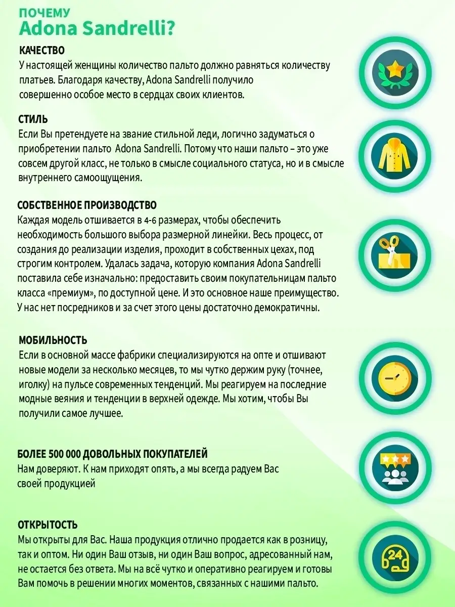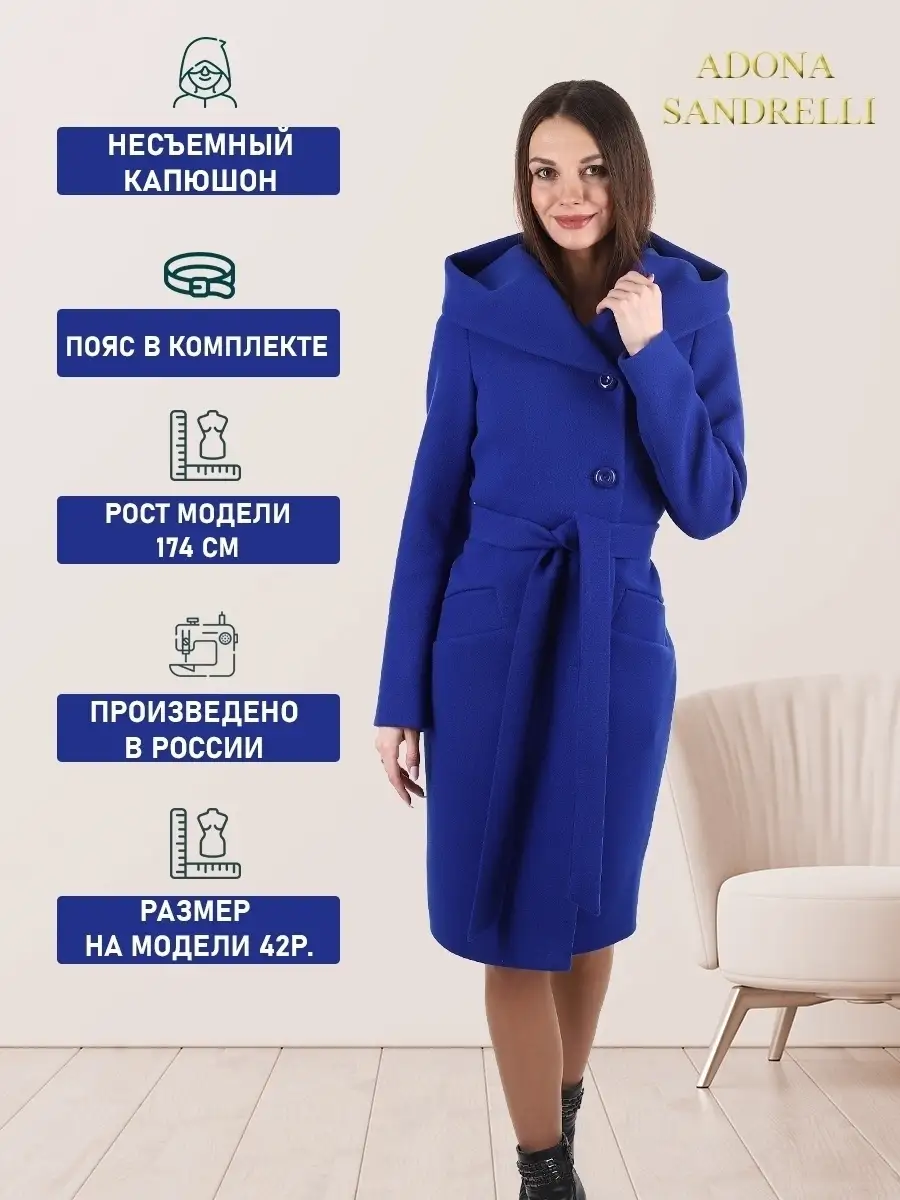 Описание: Представляем Вашему вниманию стильное женское пальто из новой коллекции Adona Sandrelli - демисезонное пальто, идеально подходящее для осени и весны. Это модное современное пальто прямого силуэта - универсальная модель, которая способна придать женственности и шарма даже самому обычному образу. Длина пальто по спинке для всех размеров составляет 101 см. (+ - 3%). Длина рукава в размерах 44 по 46 - 63 см., в размерах 48 по 52 - 64 см. Температурный режим позволяет носить его при температуре от +10 до -5 градусов. Температурный режим зависит от многих факторов (климатическая зона, ветровая нагрузка в данный момент, влажность, уровень Вашей активности, физиологические особенности организма, дополнительная одежда) и носит рекомендательный характер. Обратите внимание, что температурный режим зависит от индивидуальной восприимчивости к холоду и от Вашего теплообмена. Особенностью этой модели является несъемный капюшон, который позволяет менять образ и подстраиваться под разные погодные условия. Он позволяет менять образ и подстраиваться под разные погодные условия. Застегивается на пуговицы в тон пальто. Прорезные карманы украшены широкой листочкой, которая придает модели особый шарм. Пальто имеет пояс из основной ткани, который красиво подчеркивает талию. Данная модель пальто специально пошита без шлевок (петелек для пояса), так как данную модель пальто Вы можете носить как с поясом, так и без пояса. Смотря какое у Вас настроение)) Именно поэтому на этой модели отсутствуют шлёвки. Застегивается пальто на пуговицы в один цвет с пальто, создавая эффект единого целого. Это демисезонное женское пальто доступно в больших размерах и идеально подходит для молодежной и современной коллекции. Оно также подходит для беременных на ранних сроках. Пальто сделано из шерстяной ткани, что обеспечивает тепло и комфорт в непогоду. Прекрасно сочетается с вашим осенне-зимним гардеробом. Модель придумана для Вашего удобства и комфорта, идеально подходит как на повседневных прогулках по городу, так и на деловых встречах. Пальто на рекламных фотографиях представлено в двух вариантах стиля: классическом и повседневном, Вы можете самостоятельно выбрать свой образ. Рост девушек моделей на фото и видео составляет 170-174 см. Зная свой рост, Вы можете спроектировать длину пальто на себя. Это модное пальто станет прекрасным дополнением к вашему осенне-зимнему гардеробу. Чтобы поддерживать новое состояние пальто, рекомендуется в конце каждого сезона пользоваться услугами химчистки. Это теплое, универсальное и функциональное пальто пошито и в больших размерах, до 52-го размера включительно. Во избежание споров (пальто маломерит, или большемерит) предлагаем всем ознакомиться с нижеприведенной таблицей по размерной сетке (ОГ-ОТ-ОБ): 42-ой размер: ОГ82-86, ОТ62-66, ОБ90-94; 44-ый размер: ОГ86-90, ОТ66-70, ОБ94-98; 46-ой размер: ОГ90-94, ОТ70-74, ОБ98-102; 48-ой размер: ОГ94-98, ОТ74-78, ОБ102-106; 50-ый размер: ОГ98-102, ОТ78-82, ОБ106-110; 52-ой размер: ОГ102-106, ОТ82-86, ОБ110-114. Непревзойденная и привлекательная верхняя одежда, которую можно надеть как на прогулку, так и в офисе, на встречу, свидание или на вечеринку. Карманы и подкладка, качество и дизайн - каждый элемент проработан до совершенства. Это модное, современное и молодежное пальто, которое станет прекрасным дополнением к вашему гардеробу. Дорогие наши покупательницы!