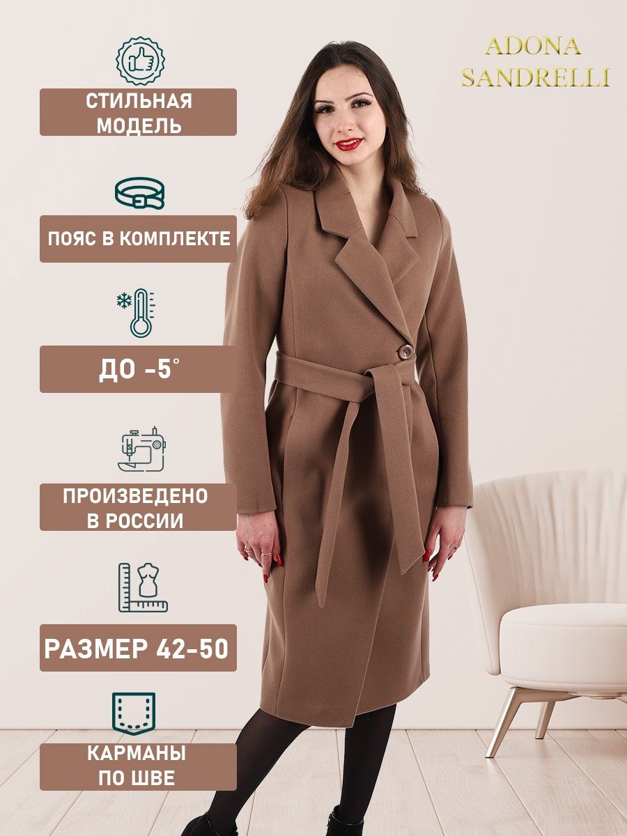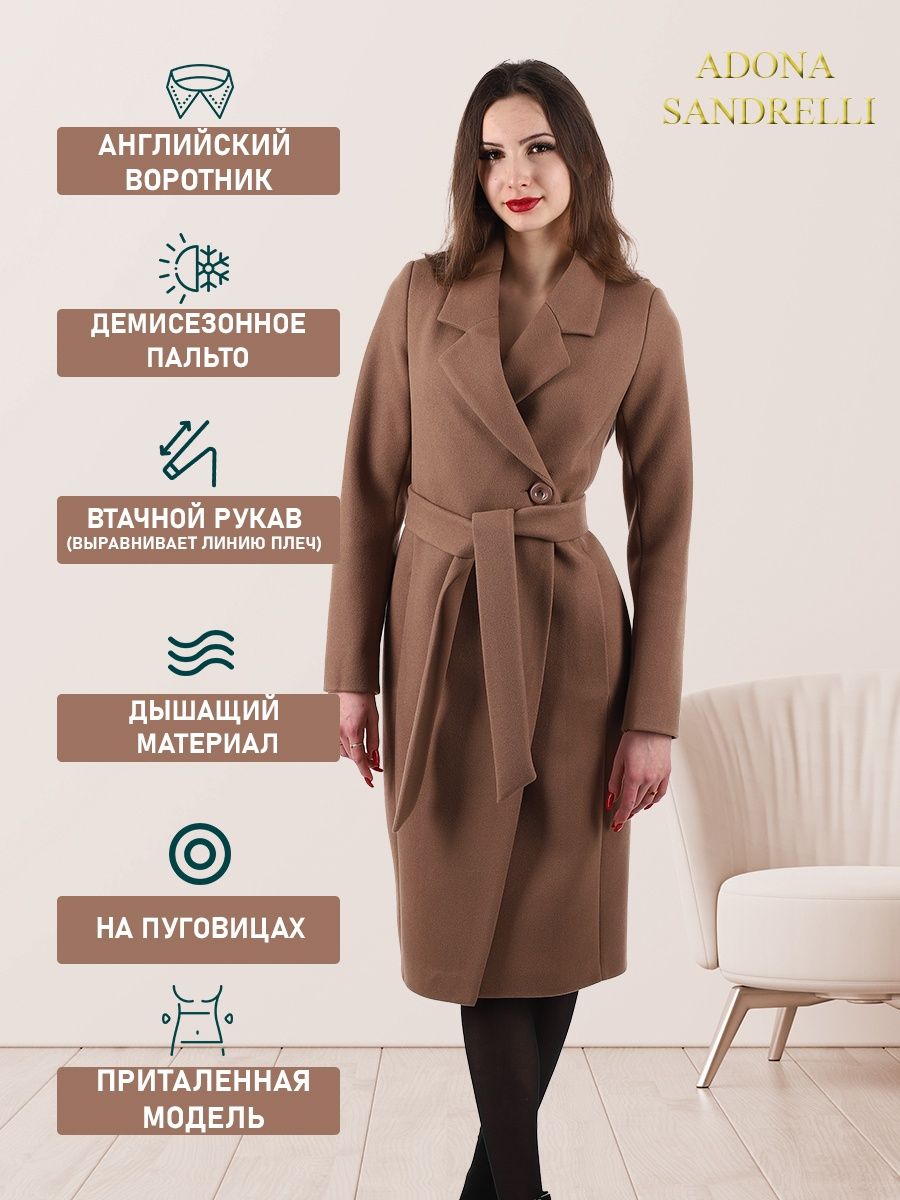 Описание: Женственное однобортное пальто облегающего покроя с прорезными карманами в швах и английским отложным воротником. Длина пальто по спинке, для всех размеров 110 см. (+ - 3%). Температурный режим от +10 до -5 градусов. Особенностью модели является дышащий материал. Модель пальто маломерит. Рост девушек моделей 174-179 см. Дорогие наши покупательницы! Мы, производитель пальто Adona Sandrelli, не торгуем со своего склада. Все наши пальто хранятся на складах WB и уже оттуда отправляются к Вам, на основании заявок от Вас. Мы не задерживаем отправку к Вам наших пальто, так как не можем на это повлиять. При отправке товара мы не путаем наши пальто с чужими товарами, так как у нас нет других товаров, кроме наших пальто. Мы не делаем пересортицу по моделям, размерам и расцветкам пальто, так как мы не формируем отправки к Вам. Мы не производим переупаковку наших пальто на складах WB в комок, замотанный скотчем, так у нас нет доступа к складам WB. Мы не удерживаем с Вас стоимость возвратов, точно так же, как и не выдаём Вам чек о покупке нашего пальто, так как это не мы продали Вам пальто Adona Sandrelli. Мы не теряем наши пояса, потому что перед отправкой в WB наша продукция проходит ОТК. Мы не пачкаем наши пальто перед отправкой. Мы не отрываем пуговицы «с мясом» от наших пальто. Мы не эксплуатируем наши пальто перед отправкой в WB. Надеемся, в случае возникновения проблем, Вы оформите пальто как брак, для изъятия из оборота, иначе оно отправиться к другому покупателю. Для нас важно, чтобы каждая наша покупательница осталась довольна покупкой и собой. Со склада производителя Adona Sandrelli, пальто отправляются в полной комплектации и в идеальном виде - отпаренные и упакованные в запаянные полиэтиленовые чехлы, с индивидуальной вешалкой, в состоянии «получила, надела, ушла с улыбкой».