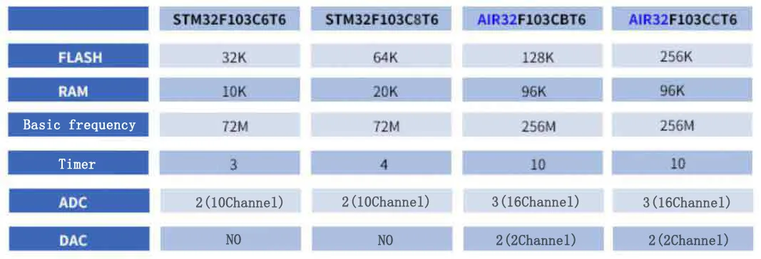[] Air32F103-это серия чипов, первоначальной моделью которой является Air32F103CBT6. Его периферийная и аппаратная конструкция совместима с некоторыми основными моделями F103 на рынке, с основной частотой до 256 МБ, 96 КБ ОЗУ + 128 КБ флэш-памяти, И каждый ввод-вывод может быть установлен с независимым внутренним подтягивающий резистор.