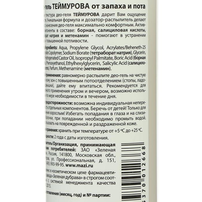 Описание: Описание: део-гель Теймурова от запаха и пота, 100 мл Нежная текстура део-геля "Теймурова" дарит Вам ощущение свежести. Уникальная формула и дозатор-распылитель делают процесс нанесения максимально комфортным. Активные компоненты в составе: борная, салициловая кислоты, тетраборат натрия и метенамин - помогают в устранении запаха и избыточной потливости. Меры предосторожности: не применять лицам, имеющим индивидуальную непереносимость ингредиентов, входящих в состав. Не использовать для детей в возрасте до 3 лет. Не использовать на поврежденной или раздраженной коже. Избегать попадания в глаза и на слизистые оболочки, при попадании необходимо промыть водой. Беречь от детей!