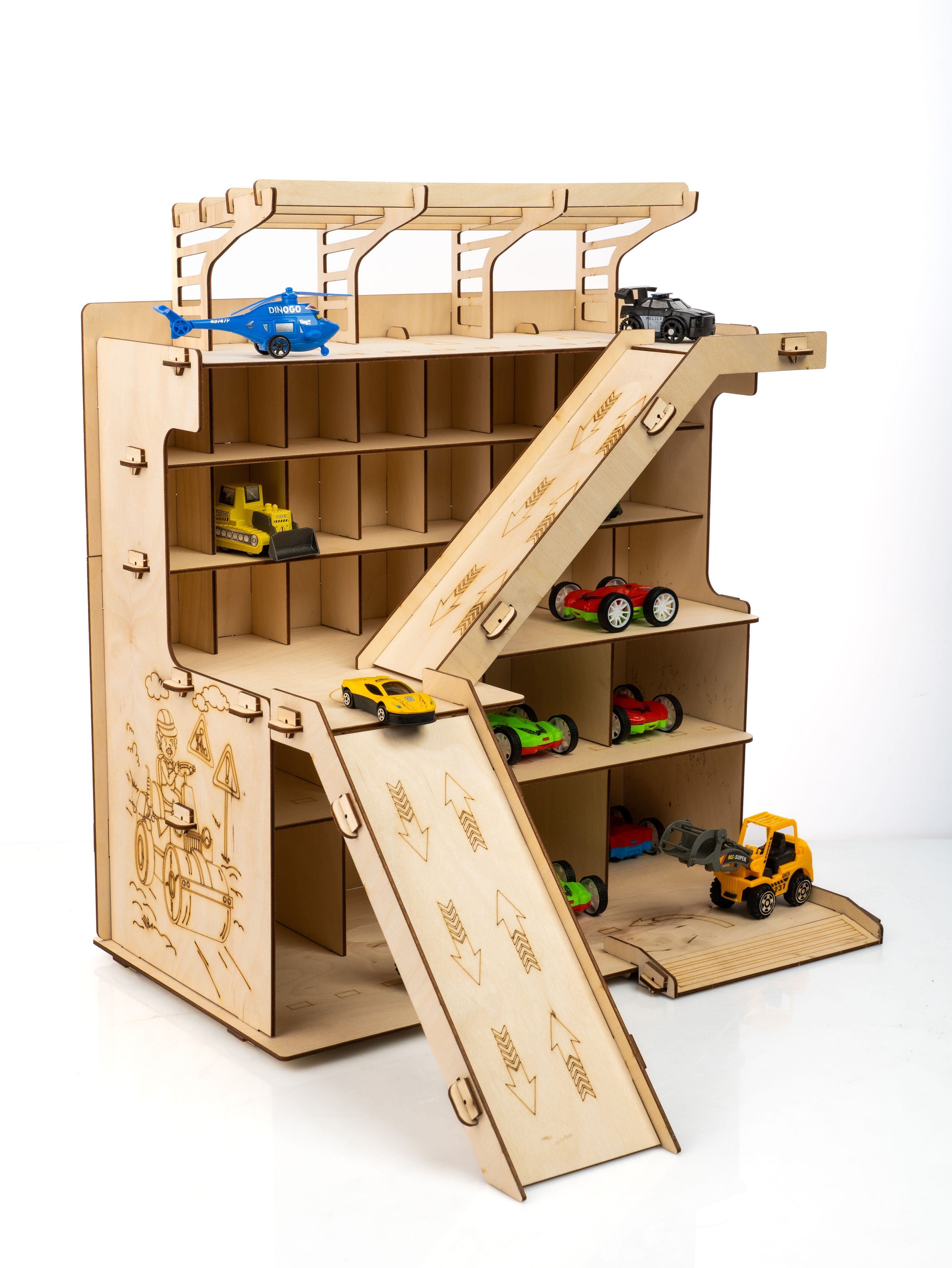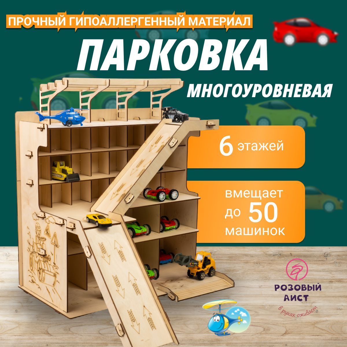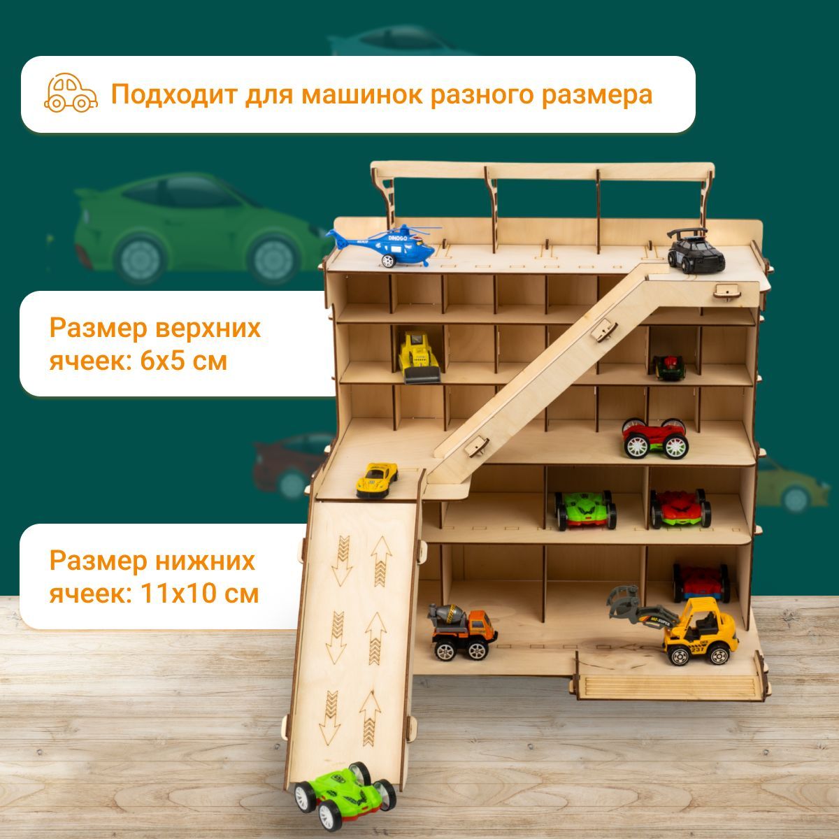 Описание: Многоуровневая парковка-это отличный подарок на день рождения Вашему ребенку. Паркинг для машин можно раскрасить красками, фломастерами, карандашами или мелками. Игрушечный гараж парковка с 2 горками, шлагбаумом вмещает огромное количество игрушечного транспорта. С новым набором "многоуровневая парковка" появится возможность создать свой собственный гараж и полностью погрузиться в мир игрушечных транспортных средств. Супер-автопаркинг станет настоящим чудом для маленьких мальчишек и их игровых коллекций машинок! Этот оригинальный комплекс представляет собой большой ящик с 6 уровнями для хранения дорожных знаков, поли, вертолетов, танков, самосвалов, автовозов, мотоциклов, и даже имеется горка и вертолетная площадка. Деревянная парковка - отличный способ развивать моторику, усидчивость, координацию, мышление и воображение ребенка. Такие настольные логические игры лего и развивающие игрушки помогут вашему ребенку стать умнее и научиться лучше ориентироваться в пространстве. Детские машины, тракторы, каталки, полицейские и пожарные машины, скорая помощь и робокар - все эти машинки можно разместить в автопарковке и наслаждаться дрифтом и гонками. Парковка детская - это идеальный подарок на день рождения, Новый Год или любой другой праздник. Оригинальный дизайн полки сделает его замечательным украшением детской комнаты. Парковка деревянная подойдет как для игры в домашних условиях, так и для игр на улице. Не упустите возможность порадовать своих детей новым подарочным игрушечным набором - деревянная парковка для машин. Покупайте сейчас автопарковку и дарите радость и счастье вашим детям!