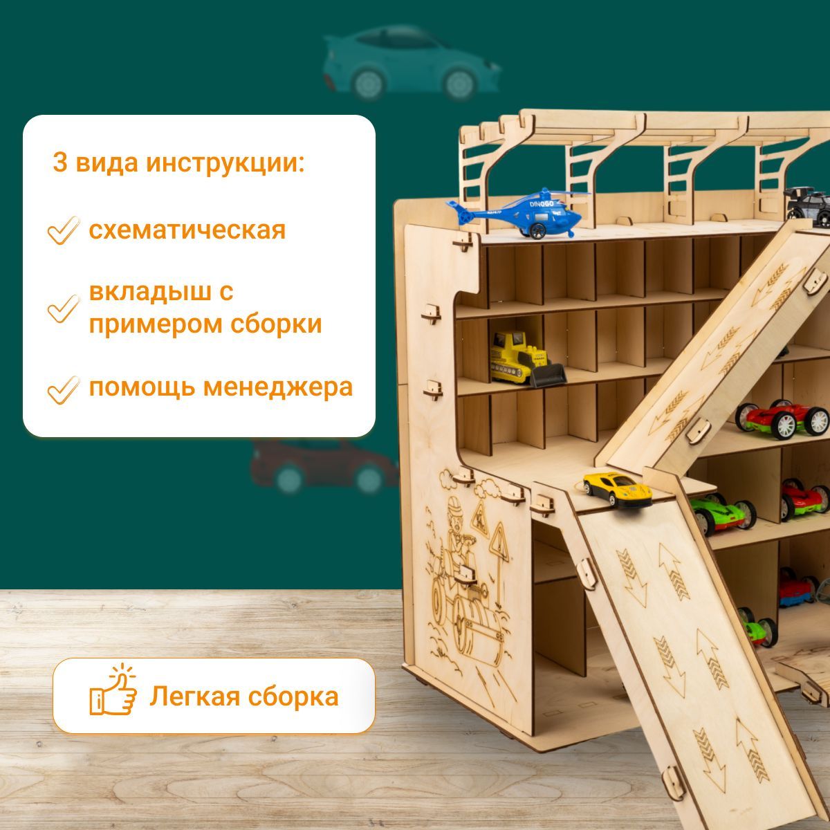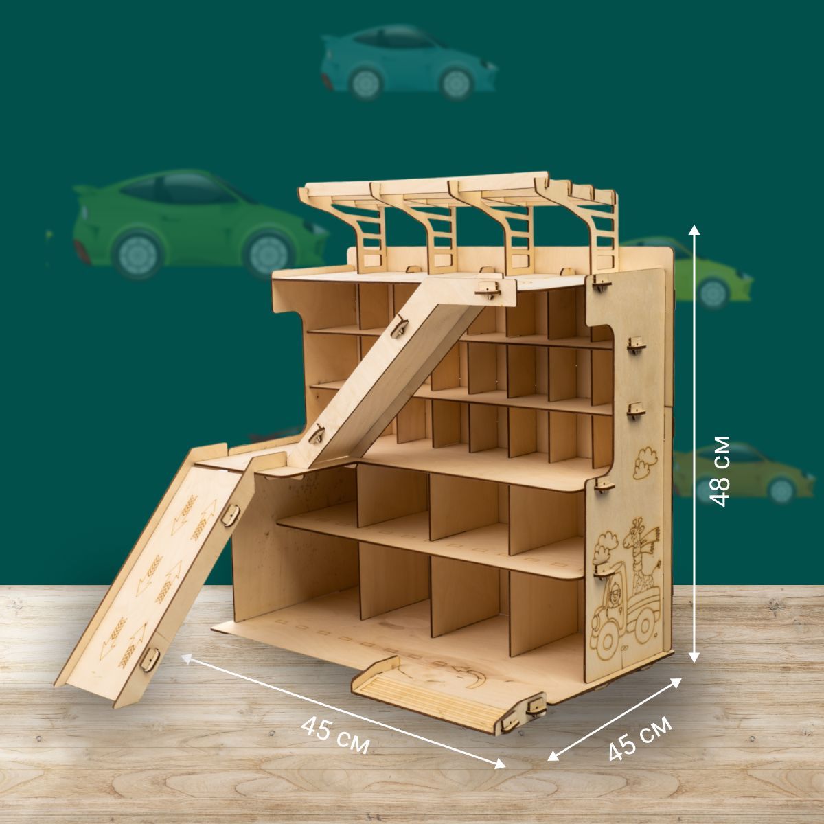 Деревянная парковка Гараж для машинок XL полка для игрушек подарок на день рождения ребенку